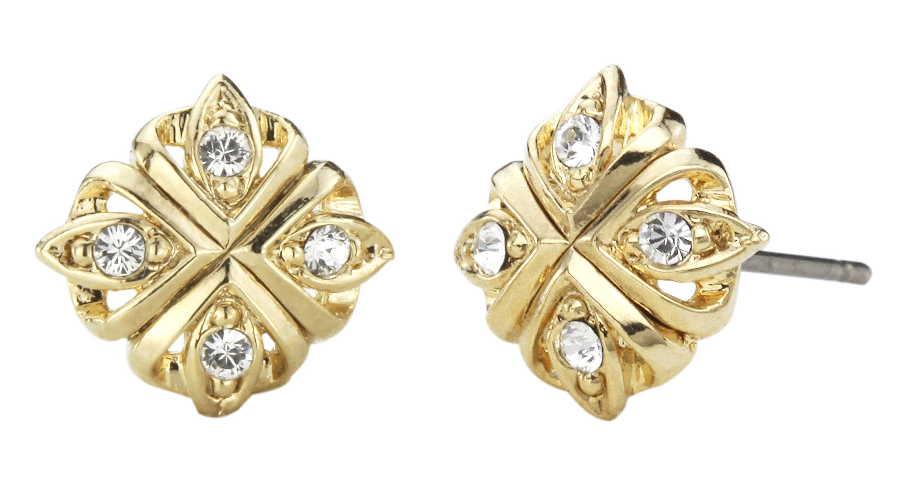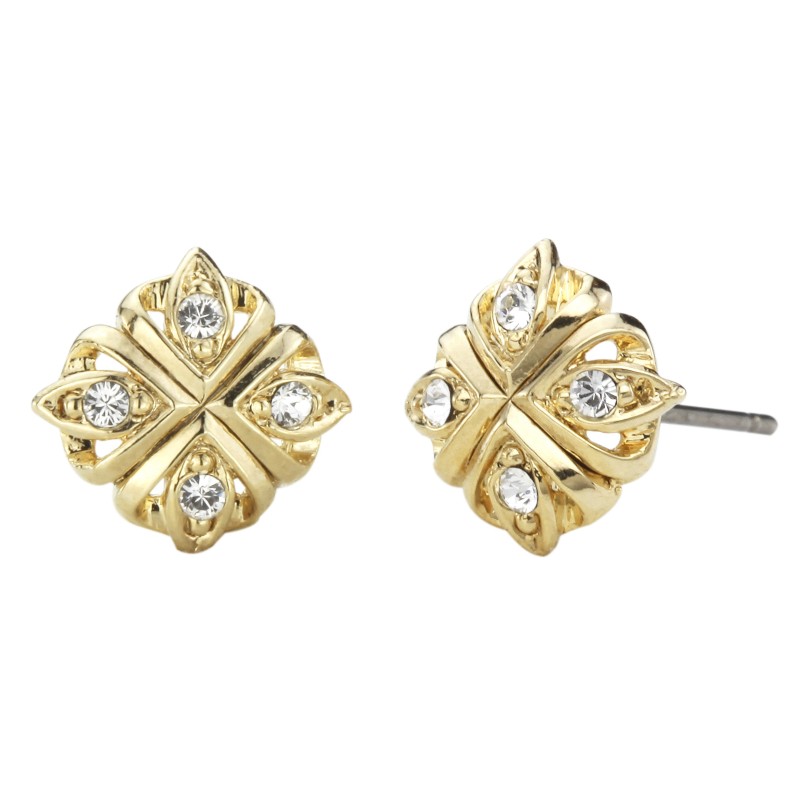 Een paar chique oorstekers van Traveller, geïnspireerd door het magische Midden-Oosten. De 22 karaat vergulde oorstekers (kernmateriaal: metaal) bestaan uit vier identieke stukjes die samen een symmetrisch figuur vormen. De kern van deze stukjes zijn de witte Preciosa kristallen. De oorbellen hebben een diameter van 10 millimeter en wegen per stuk maar 1 gram. Doordat de stekers gemaakt zijn van antiallergisch titanium, kan iedereen deze oorbellen (ver)dragen!