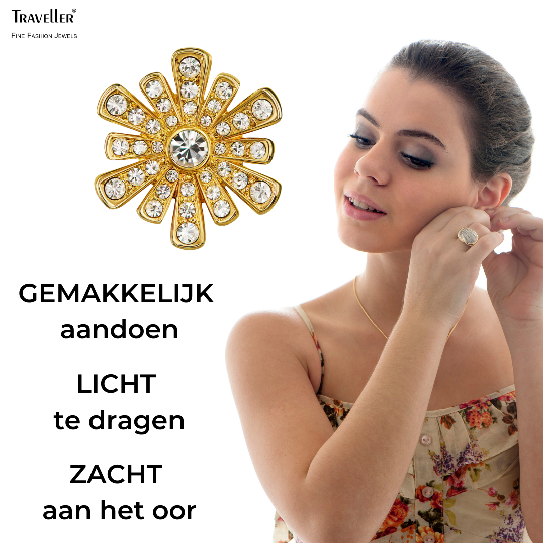 Dit paar prachtige oorbellen van Traveller is een echte eyecatcher. Een zilver kristal vormt het hart van een bloem. de blaadjes van deze vergulde oorclips zijn bezaaid met kristallen van Preciosa. Per stuk wegen de oorbellen maar 2 gram en dankzij het unieke sluitingssysteem van Traveller zijn ze zeer licht, comfortabel en veilig om te dragen.