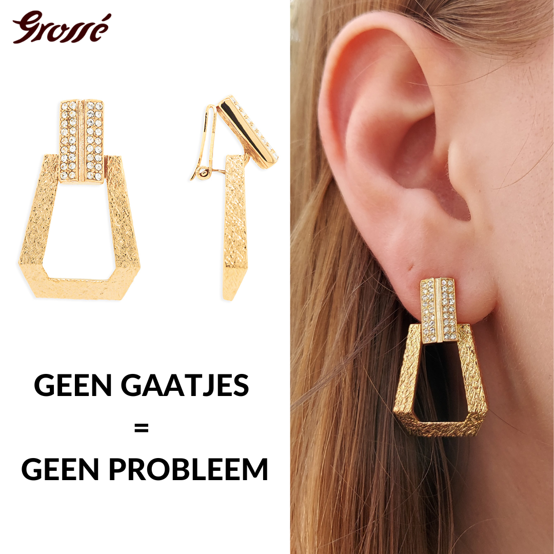 Goud, glitter, gewaagd is waar het in de serie Art Deco Tribe om draait. Deze oorclips van Grossé zijn waar chique en modern op de beste manier samenkomen in een uniek design. De oorclips bestaan uit een grote geometrische vorm met daarboven een rechthoekje dat bezaaid is met kristallen van Preciosa. In totaal zijn de met 22 karaat goud vergulde oorbellen zo'n 30 x 20 millimeter groot. Dankzij het luxe sluitingssysteem van Grossé zijn deze oorbellen erg aangenaam om te dragen.