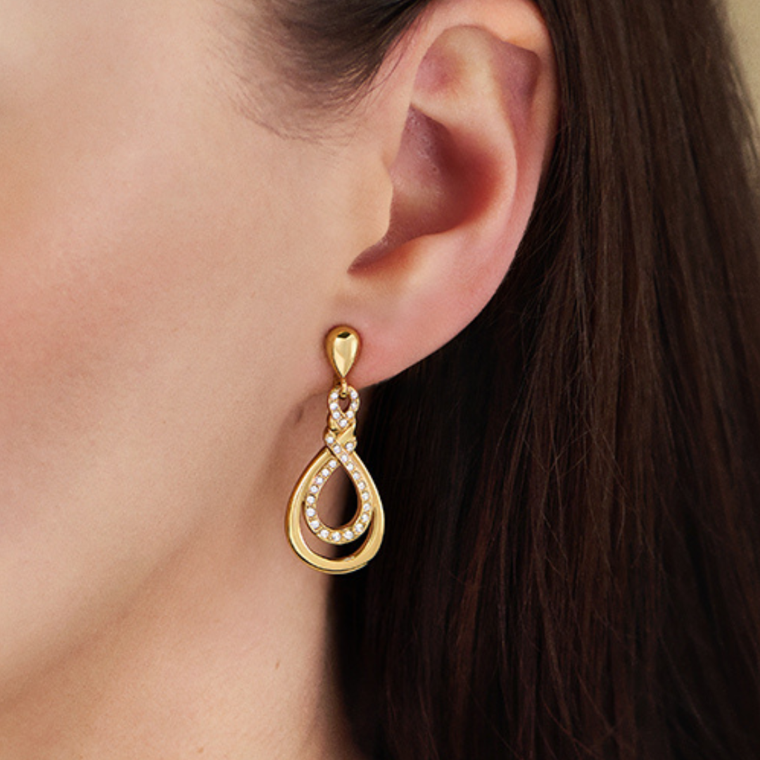 Wauw wat hebben deze oorclips van Traveller een prachtig design, een echte eye-catcher maar niet overweldigend. De twee lussen hangen in elkaar gedraaid waarbij de binnenste lus is bezaaid met schitterende kristallen van Preciosa. De oorhangers zijn met 22 karaat goud verguld en zijn 35 x 15 millimeter groot, ze wegen per stuk 3,5 gram. Dankzij het unieke sluitingssysteem van Traveller zijn deze oorclips zeer comfortabel, licht en veilig om te dragen.