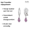 Deze chique oorclips van Traveller schitteren aan je oren. Aan de geplatineerde oorbellen hangt een paars kristal van Preciosa in de vorm van een druppel. Ook het bovenste deel van de oorbellen bestaat deels uit Preciosa kristallen. De clips zijn 30 x 5 millimeter groot en wegen per stuk slechts 2 gram. Dankzij het unieke sluitingssysteem van Traveller zijn deze clips zeer licht, comfortabel en veilig om te dragen.