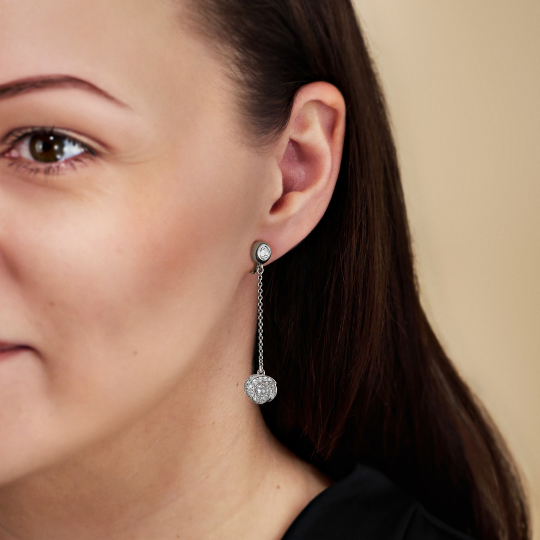 Deze oorclips van Traveller zijn mooi verfijnd en geheel geplatineerd. De oorhangers bestaan uit een kristal van Preciosa als "knopje"met daaraan een schakelsnoertje waar een lotusblad van schitterende Preciosa kristallen aanhangt. De oorclips hebben een afmeting van 50 x 10 millimeter en wegen 3 gram per oorbel. Dankzij het unieke sluitingssysteem van Traveller zijn deze oorclips zeer comfortabel, licht en veilig om te dragen.
