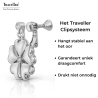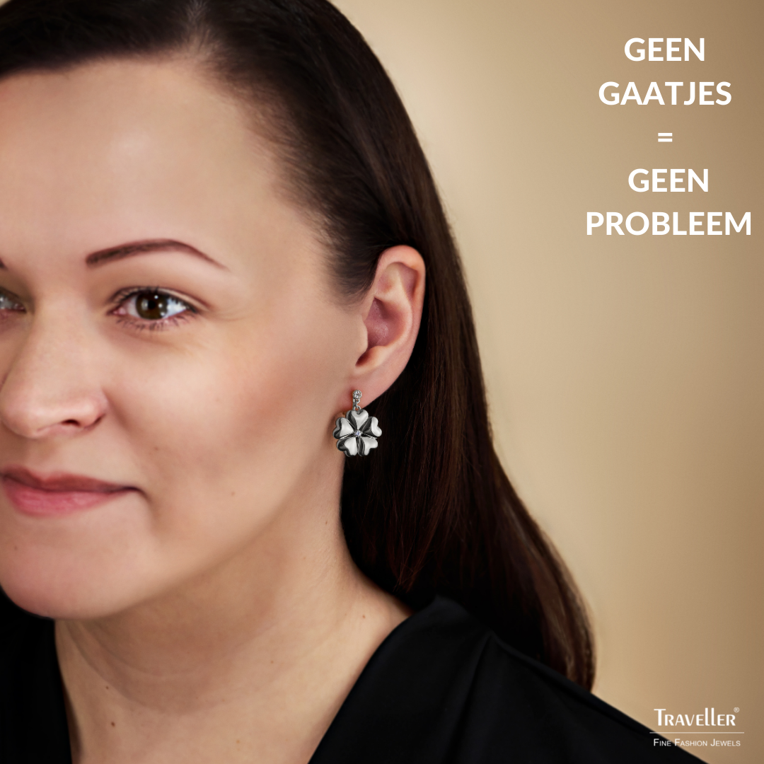 Deze bijzondere oorbellen van Traveller hebben een opvallend design. De oorclips bestaan uit een fonkelend kristal als "knopje", daaronder hangt een bloem met zilverkleurige hartenblaadjes met in het middel als kern wederom een sprankelend kristal van Preciosa. Deze hoogwaardige kristallen worden door Preciosa gemaakt. De blaadjes zijn, net als de andere zilverkleurige onderdelen, geplatineerd. De oorbellen hebben een afmeting van 25 bij 20 millimeter en wegen 4 gram per oorbel.