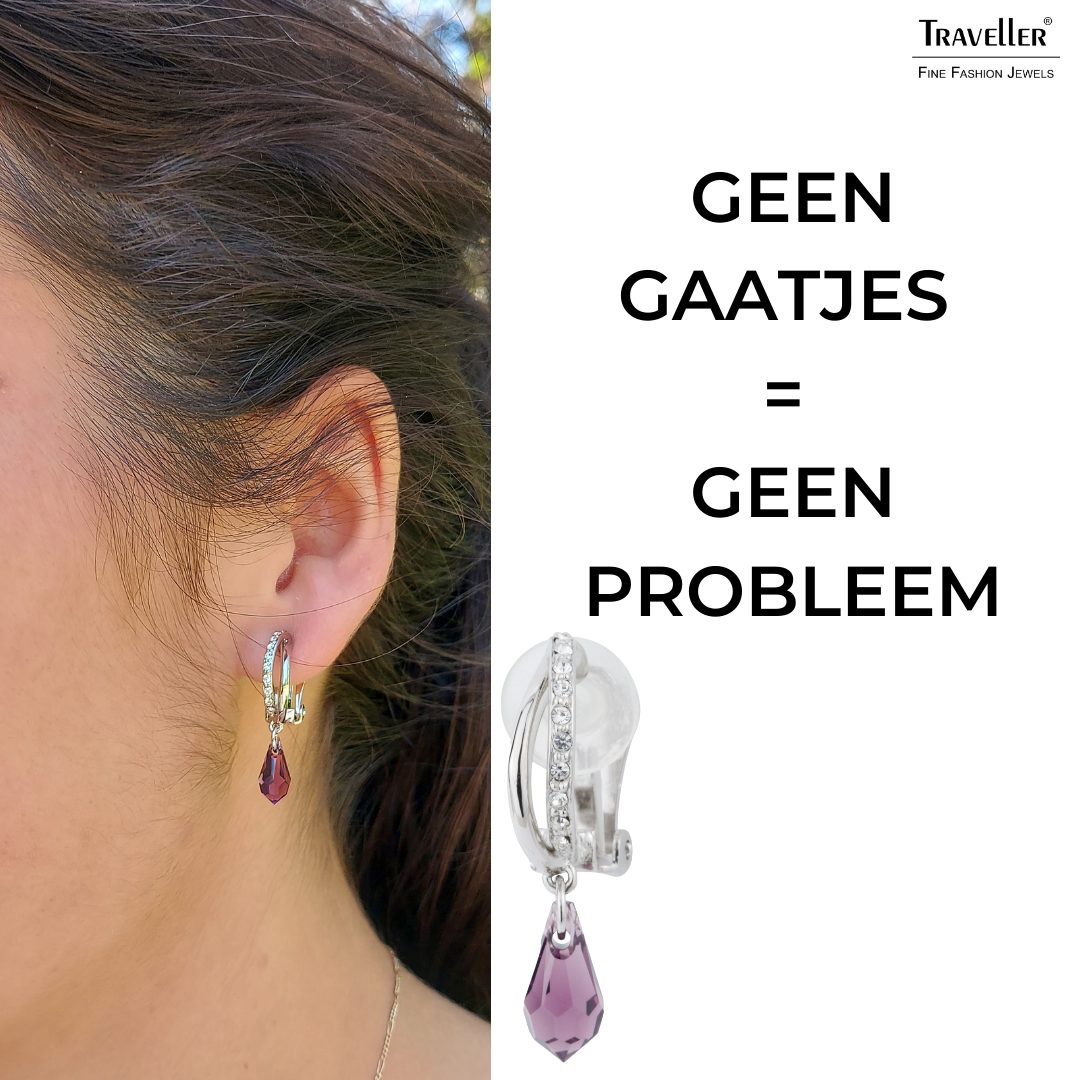 Deze chique oorclips van Traveller schitteren aan je oren. Aan de geplatineerde oorbellen hangt een paars kristal van Preciosa in de vorm van een druppel. Ook het bovenste deel van de oorbellen bestaat deels uit Preciosa kristallen. De clips zijn 30 x 5 millimeter groot en wegen per stuk slechts 2 gram. Dankzij het unieke sluitingssysteem van Traveller zijn deze clips zeer licht, comfortabel en veilig om te dragen.