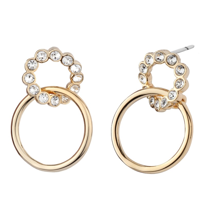 Dit unieke paar oorstekers van Traveller is sierlijk en vrolijk. De met 22 karaat goud vergulde oorbellen bestaan uit twee ringen die in elkaar hangen. De bovenste is gevormd door Preciosa kristallen. De onderste is wat groter en hangt los in de andere. In totaal zijn de oorbellen 24 x 17 millimeter groot en per stuk wegen ze slechts 2 gram, waardoor ze aangenaam zijn om te dragen. Bovendien zijn de stekers gemaakt van antiallergisch titanium. Zo kan iedereen de oorbellen (ver)dragen!