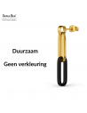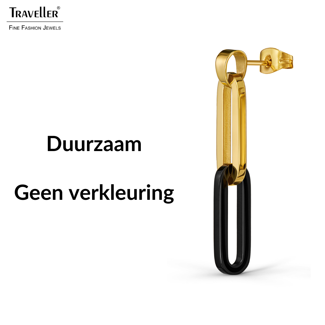 Een classy design van Traveller, chique en energiek. Deze edelstalen oorbellen bestaan uit, aan de bovenzijde, een goud- en daaronder een zwartkleurige schakel. De oorhangers hebben een afmeting van 40 x 7 millimeter en wegen per stuk 2,5 gram.
