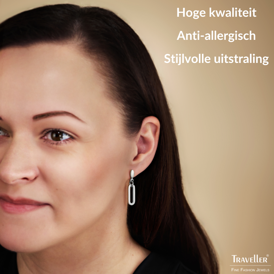 Een classy design van Traveller, chique en energiek. Deze zilverkleurige edelstalen oorbellen bestaan uit een ovale oorknopje met daaraan verbonden middels een ringetje een enkele schakel. De oorhangers hebben een afmeting van 20 x 7 millimeter en wegen per stuk 1,96 gram.