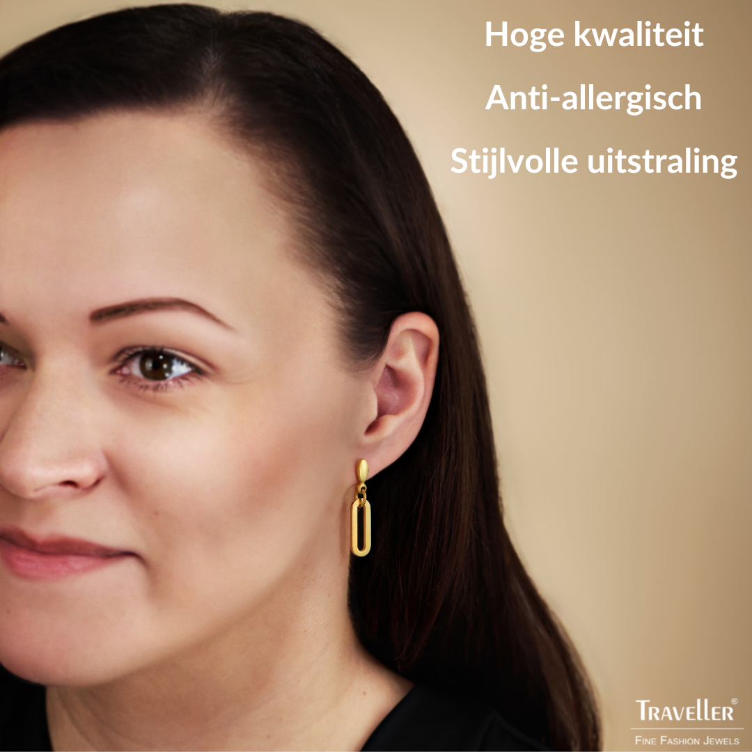 Een classy design van Traveller, chique en energiek. Deze goudkleurige edelstalen oorbellen bestaan uit een ovale oorknopje met daaraan verbonden middels een ringetje een enkele schakel. De oorhangers zijn met goud verguld, hebben een afmeting van 20 x 7 millimeter en wegen per stuk 2,05 gram.