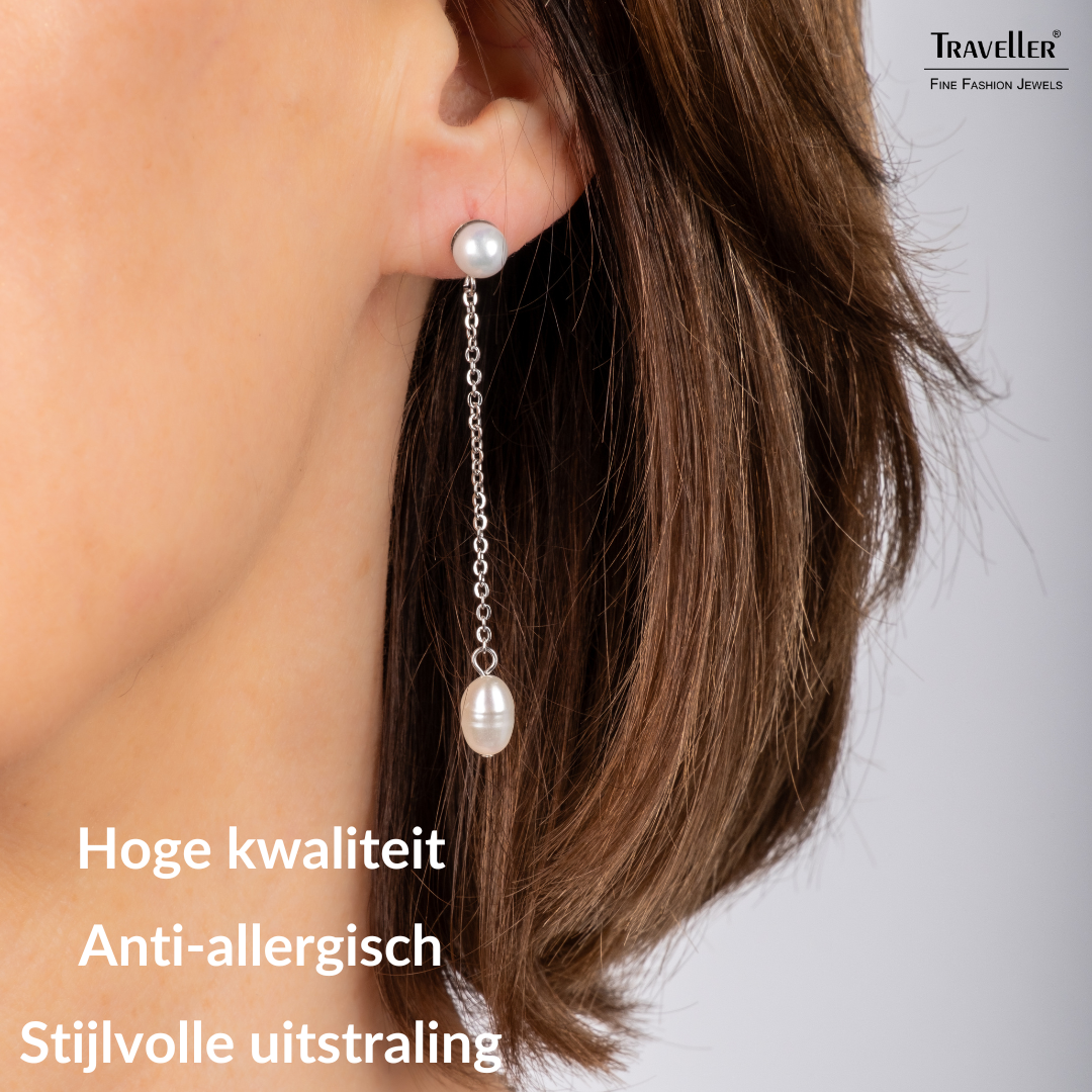 Traveller Oorhangers - Zilverkleurig - Zoetwater Parels - Wit - 6 en 10x6 mm - Edelstaal