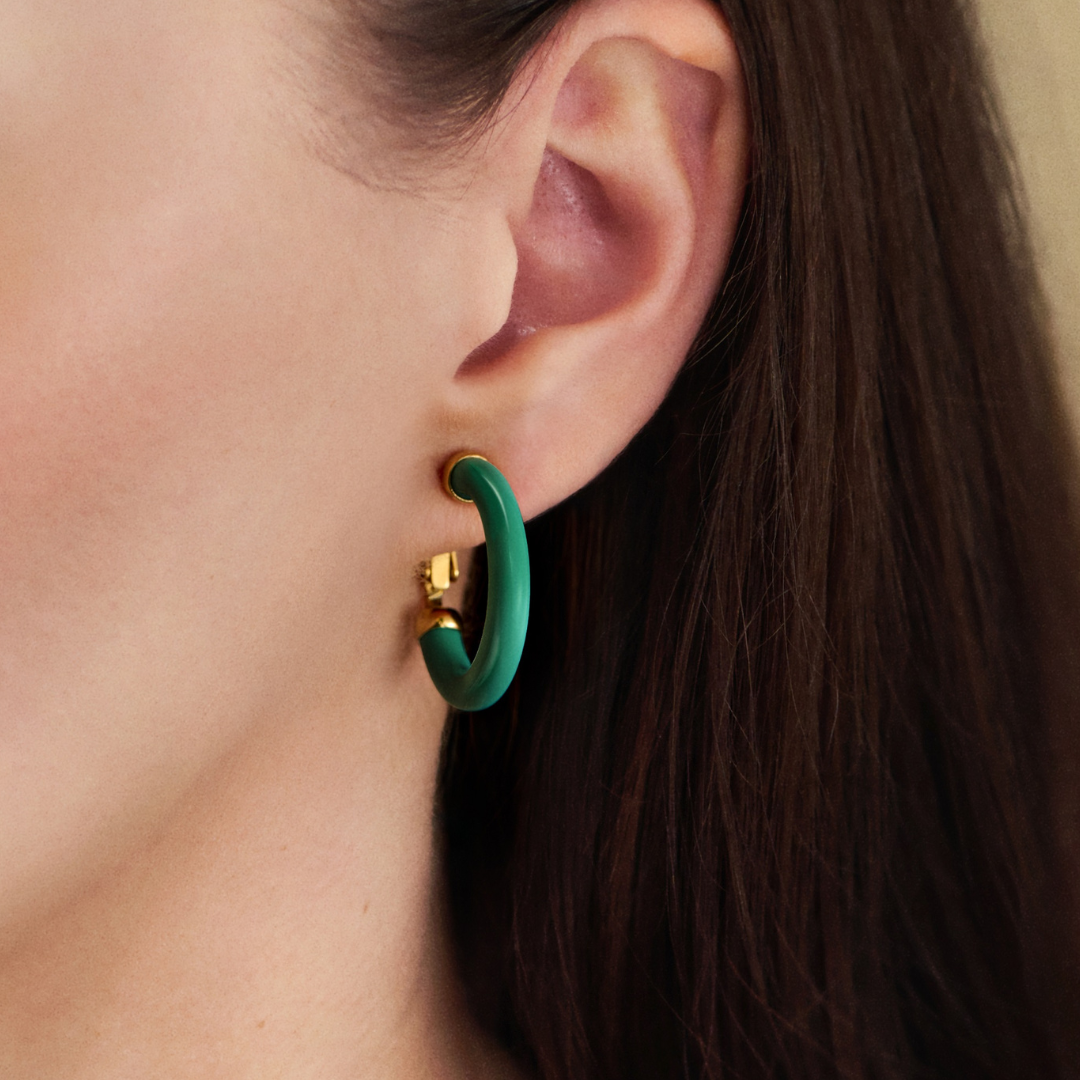Oorringen zijn al jaren een icoon in de modewereld! Ze zijn stijlvol, speels en passen bij iedere outfit. Deze oorclips zijn groen en de goudkleurige onderdelen zijn volledig verguld met 22 karaat goud. De oorringen hebben een diameter van 25 millimeter, een dikte van 4 millimeter en wegen per stuk 2 gram. Dankzij het unieke sluitingssysteem van Traveller zijn onze oorclips comfortabel, licht en veilig om te dragen.