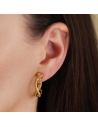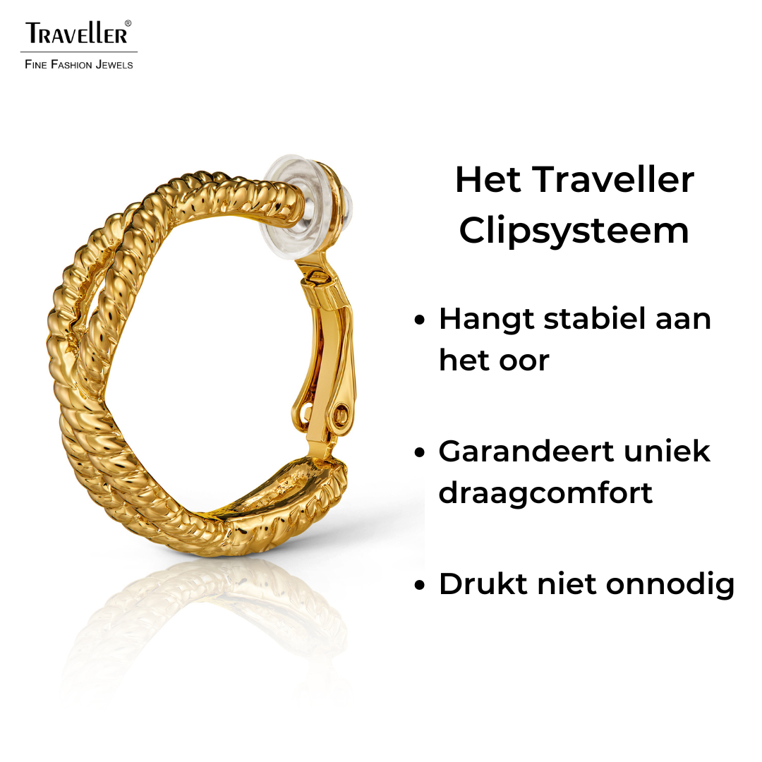 Deze oorringen van Traveller hebben een speciaal design. De vergulde oorclips hebben de vorm van een oorring. Goudkleurige strengen lijken gevlochten in een opengewerkt patroon. De clip oorringen hebben een diameter van 24 millimeter, zijn 8 millimeter breed en wegen per stuk 3,5 gram. Dankzij het unieke sluitingssysteem van Traveller zijn deze oorclips zeer comfortabel, licht en veilig om te dragen.