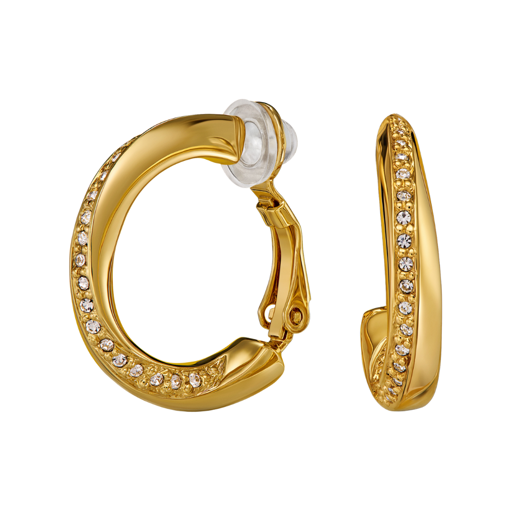 Deze oorringen van Traveller zijn subtiel maar opvallend. De vergulde oorclips hebben de vorm van een ring, daaroverheen loopt speels een band van Preciosa Kristallen. De clip oorringen hebben een diameter van 20 millimeter, zijn 4 millimeter breed en wegen per stuk 4 gram. Dankzij het unieke sluitingssysteem van Traveller zijn deze oorclips zeer comfortabel, licht en veilig om te dragen.