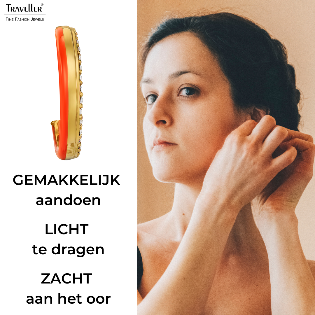 Wat een prachige oorringen van Traveller, de oorclips zijn uniek door hun speciale ontwerp. De vergulde oorclips bestaan uit 3 verschillende componenten, aan de buitenzijde een band ingelegd met met schitterende kristallen van Preciosa, in het midden een glanzende goudkleurige band en aan de binnenzijde een band glimmend koraalkleurig emaille. De clip oorringen hebben een diameter van 23 millimeter, zijn 4 millimeter breed en wegen per stuk slecht 2,7 gram. Dankzij het unieke sluitingssysteem van Traveller zijn onze oorclips zeer comfortabel, licht en veilig om te dragen.