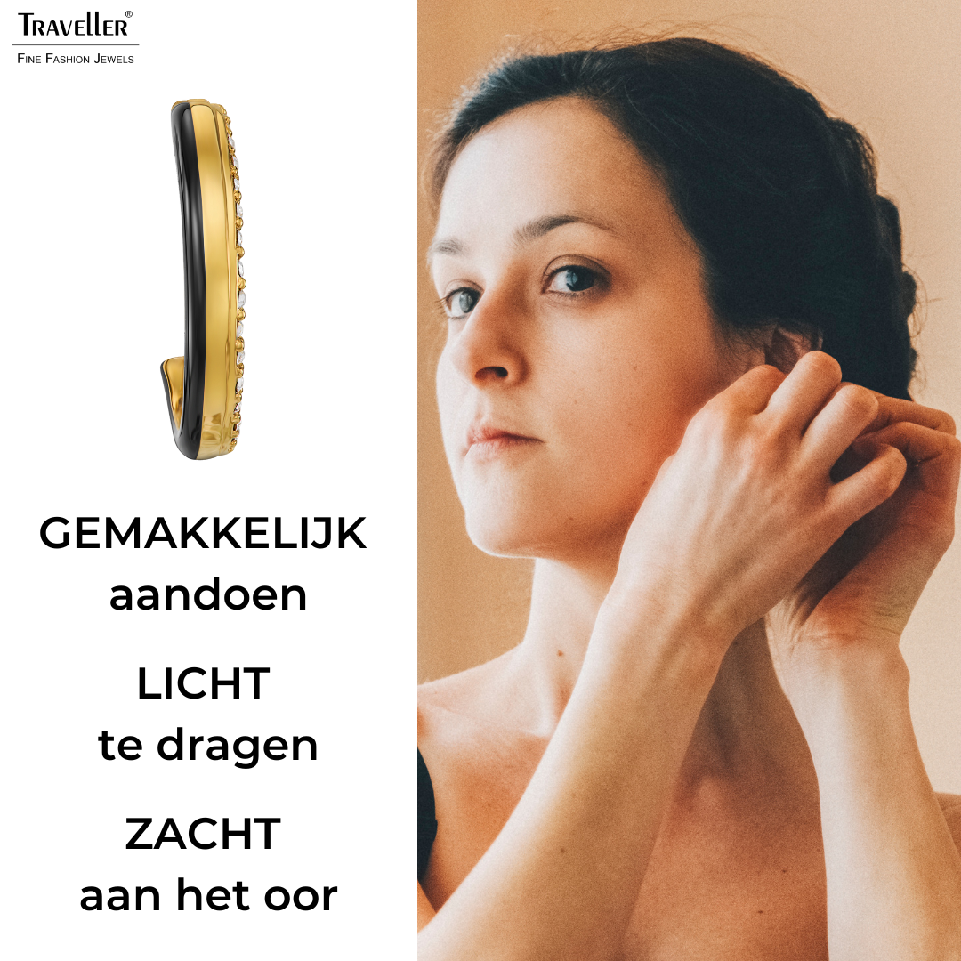 Wat een prachige oorringen van Traveller, de oorclips zijn uniek door hun speciale ontwerp. De vergulde oorclips bestaan uit 3 verschillende componenten, aan de buitenzijde een band ingelegd met met schitterende kristallen van Preciosa, in het midden een glanzende goudkleurige band en aan de binnenzijde een band glimmend zwart emaille. De clip oorringen hebben een diameter van 23 millimeter, zijn 4 millimeter breed en wegen per stuk slecht 2,7 gram. Dankzij het unieke sluitingssysteem van Traveller zijn onze oorclips zeer comfortabel, licht en veilig om te dragen.