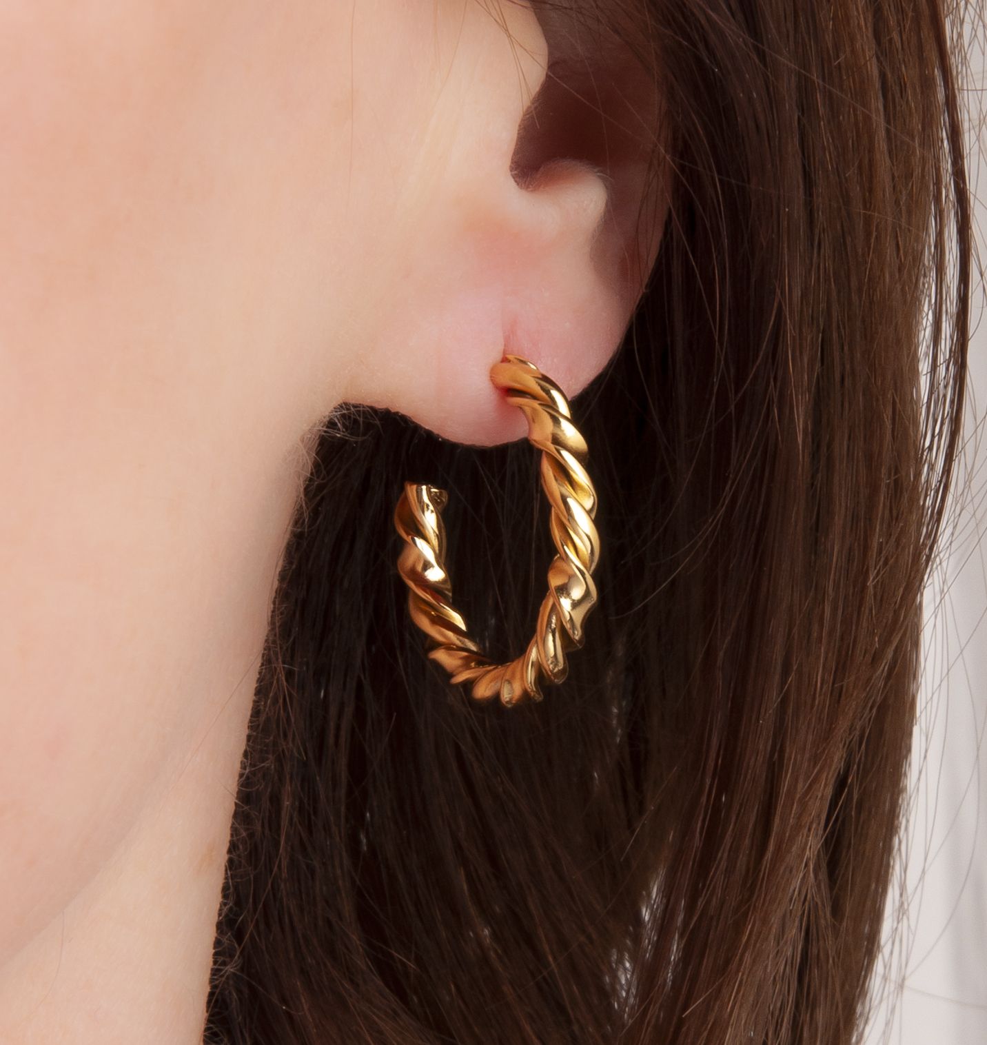 Deze chique oorbellen van Traveller hebben een tijdloos, maar opvallend design. De oorringen hebben een gedraaid effect, wat ze een unieke uitstraling geeft. De oorringen hebben een diameter van 2 centimeter en zijn 3 millimeter breed. Per stuk wegen de goudkleurige edelstalen oorbellen slechts 2,5 gram.