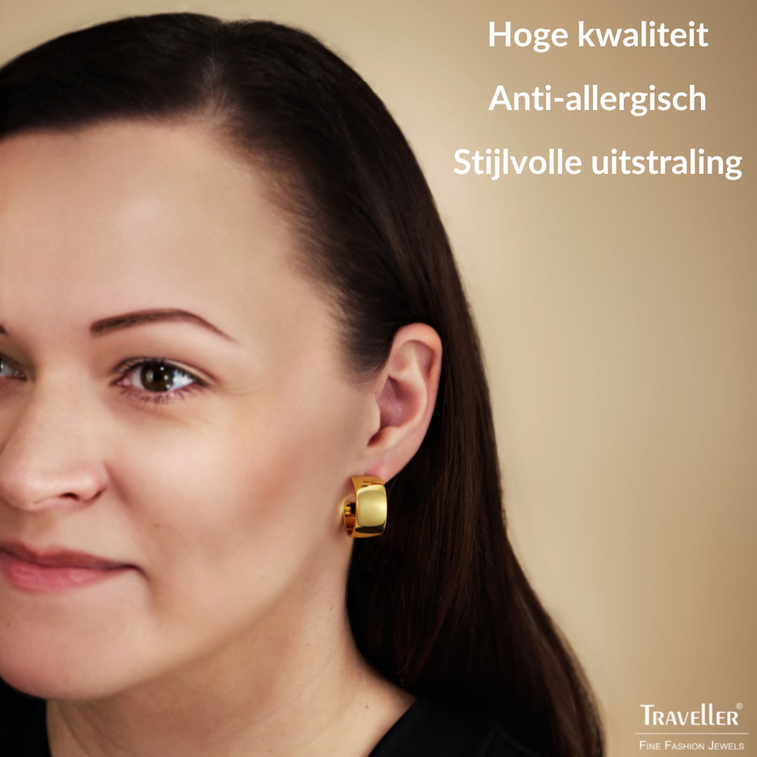 Deze glanzende goudkleurige oorringen van Traveller hebben een eigentijds uistraling, oorringen zijn altijd in de mode geweest en deze brede versie is een prachtig alternatief op de klassieke oorring. De vergulde oorbellen hebben een diameter van 22 millimeter, een breedte van 11 millimeter en wegen per stuk 7,3 gram