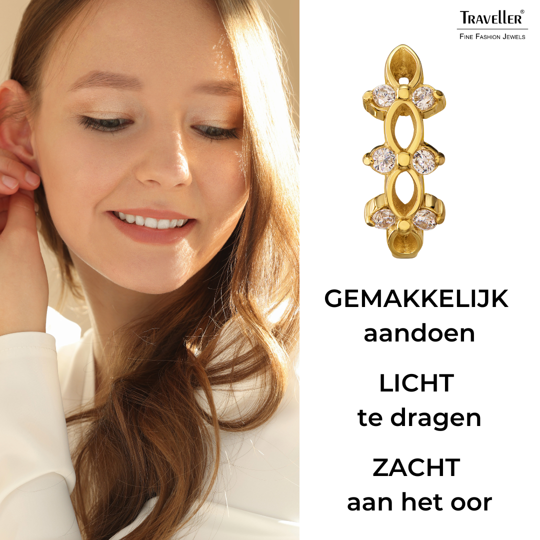 Schitter met deze speciale oorbellen van Traveller. De oorringen hebben een speciaal design met opengewerkte ovaaltjes met daartussen aan weerszijden zirkonia van Preciosa Crystals. De goudkleurige oorringen zijn gemaakt van edelstaal dat volledig verguld is met goud. De oorbellen hebben een diameter van 14 millimeter en zijn 5 millimeter breed. Per stuk wegen de oorbellen slechts 2 gram.