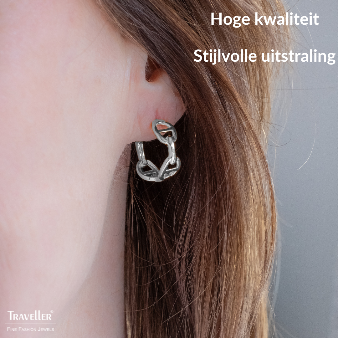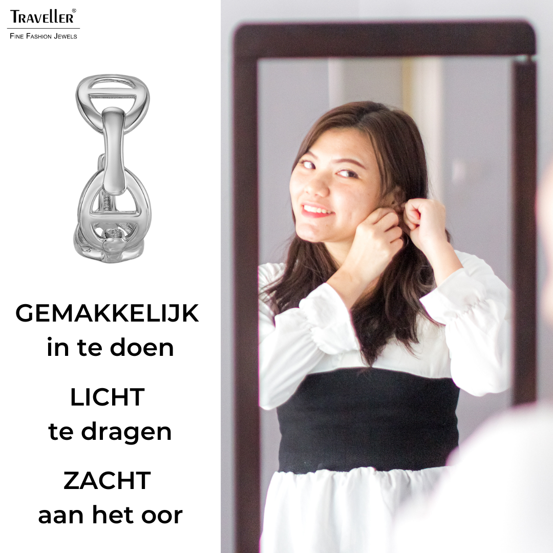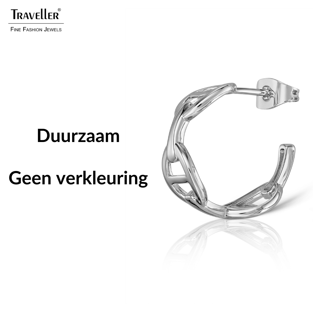 Wat een verfijnd design van Traveller zijn deze oorbellen! De oorbellen bestaan uit ovaaltjes met tussenstreep (theta's) die aan elkaar verbonden zijn door een verticaal verbindingsstukje. De zilverkleurige oorbellen zijn voor 3/4 oorringen, een kwart is open. De glanzende oorbellen zijn volledig gepalladineerd. Palladium is een edelmetaal dat ook bij zilveren sieraden wordt gebruikt als bescherming tegen oxidatie (kleurverandering). De oorbellen zijn 18 x 7 millimeter groot en wegen per stuk slechts 1,5 gram.