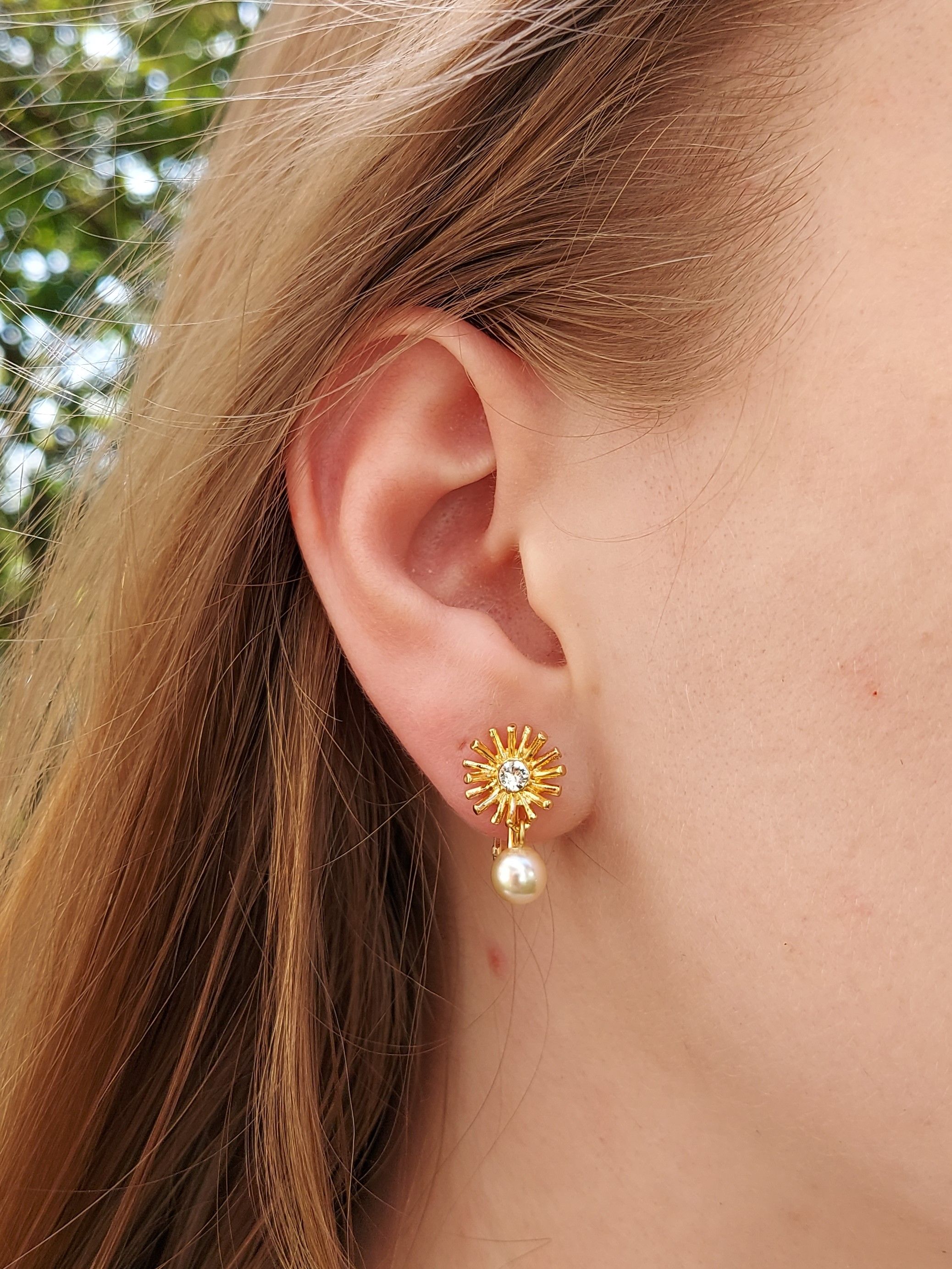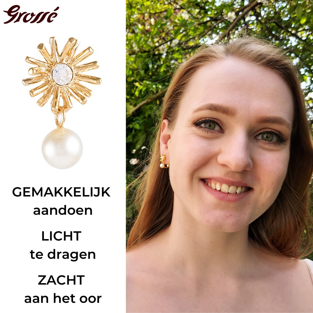Straal als de zon met deze zomerse oorbellen van Grossé! Een witte hoogwaardige imitatieparel hangt aan een zon waarvan het midden een kristal van Preciosa is. De met 22 karaat goud vergulde oorclips zijn in totaal zo'n 20 x 10 millimeter groot.