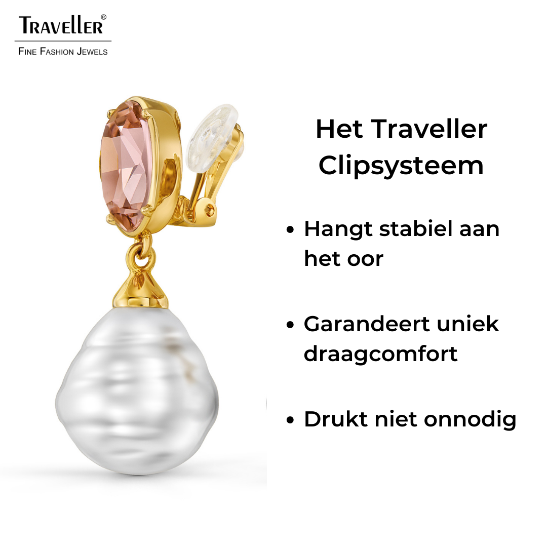 Pearls are a girls best friend en dat geldt ook voor kristallen! Deze prachtige oorbellen van Traveller hebben beide: een prachtige grote barok parel en een schitterend kristal. Het Preciosa kristal heeft de kleur Vintage Rose en is omlijst met 22 karaat verguld goud. 22 karaat goud vergulde schakeltjes verbinden de prachtige barok parel van 20 x 17 millimeter aan het kristal. De oorclips hebben een totale afmeting van 42 x 17 millimeter en wegen 11,5 gram per oorbel. Dankzij het unieke sluitingssysteem van Traveller zijn deze oorclips zeer comfortabel, licht en veilig om te dragen.
