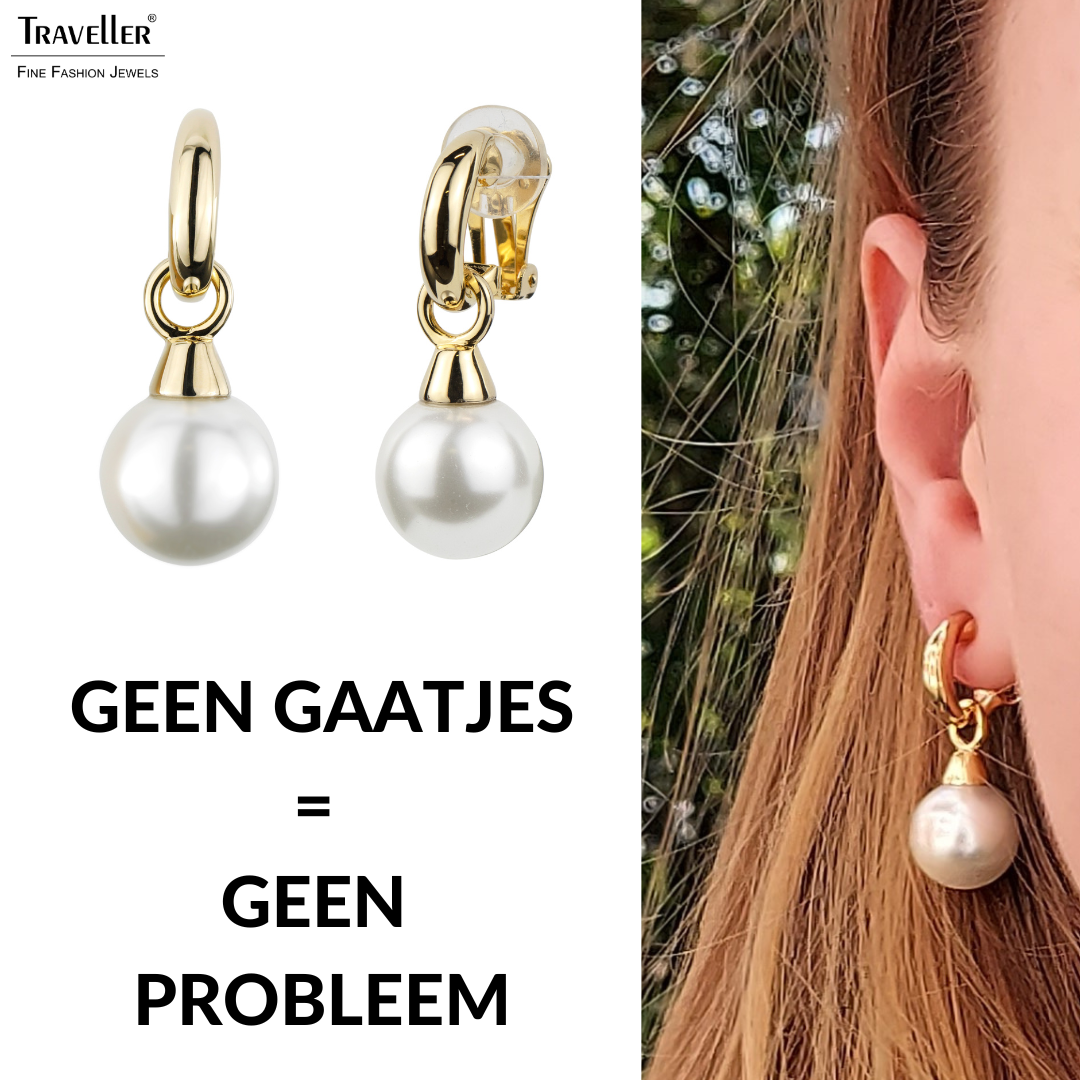 Oorclips van Traveller met een klassiek en tijdloos ontwerp. Aan de met 22 karaat goud vergulde (kernmateriaal: metaal) clips hangt een witte hoogwaardige imitatieparel, afkomstig van Mallorca – een eiland dat bekendstaat om zijn parels. De oorbellen zijn in totaal 35 x 14 millimeter groot en wegen per stuk 7 gram. Dankzij het unieke sluitingssysteem van Traveller zijn deze oorclips zeer comfortabel, licht en veilig om te dragen.