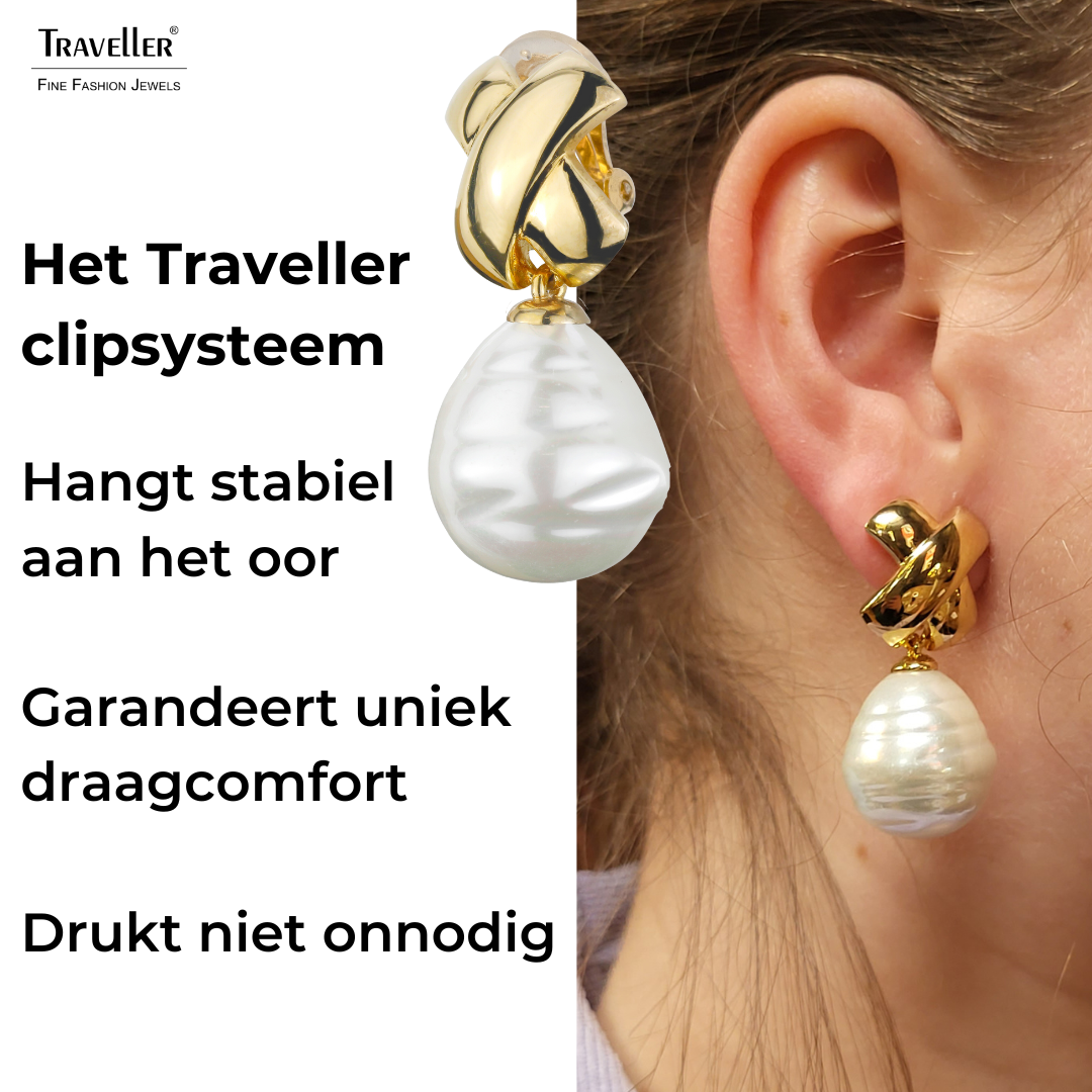 Deze chique oorbellen van Traveller met barokparels zijn majestueus. De met 22 karaat goud vergulde clip oorbellen (kernmateriaal: metaal) bestaan uit een goudkleurig kruisje waaraan een witte barokparel hangt. De vorm van deze barokparels wordt bij iedere parel met de hand vormgegeven. De hoogwaardige imitatieparels zijn afkomstig van Mallorca - een eiland dat bekendstaat om zijn parels. De clipoorbellen zijn zo'n 40 x 15 millimeter groot en wegen per stuk 12,5 gram. Dankzij het unieke clipsluitingssysteem van Traveller zijn deze oorclips zeer comfortabel, veilig en licht om te dragen!