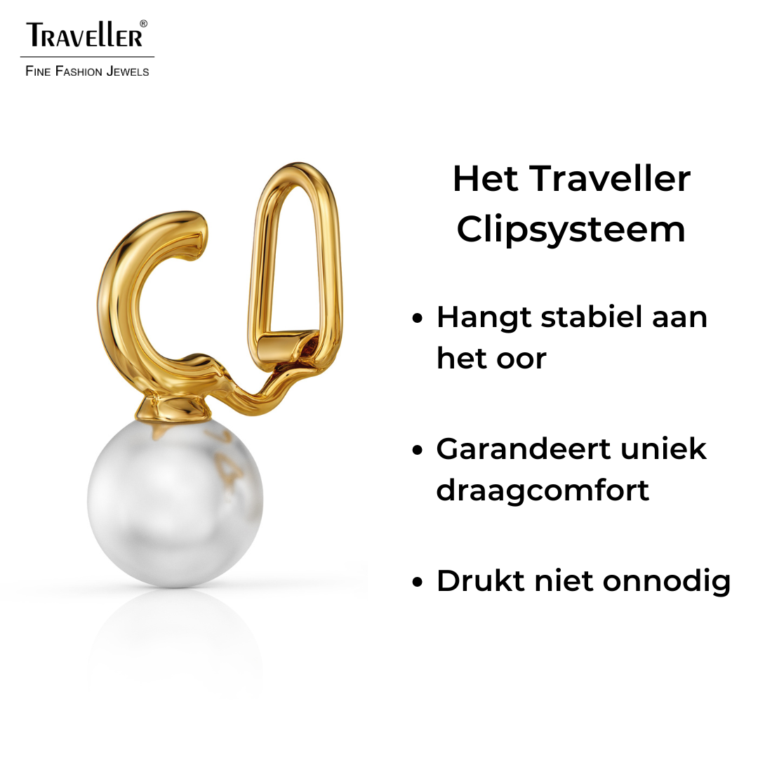 Oorbellen van Traveller met een klassiek en tijdloos ontwerp. Deze oorclips staan bij elke outfit en laten je altijd stralen! Aan de met 22 karaat goud vergulde clips hangt een hoogwaardige witte imitatieparel, afkomstig van Mallorca – een eiland dat bekendstaat om zijn parels. De oorbellen zijn in totaal 20 x 10 millimeter groot en wegen per stuk 2,5 gram. Dankzij het unieke sluitingssysteem van Traveller zijn deze oorclips zeer comfortabel, licht en veilig om te dragen.
