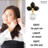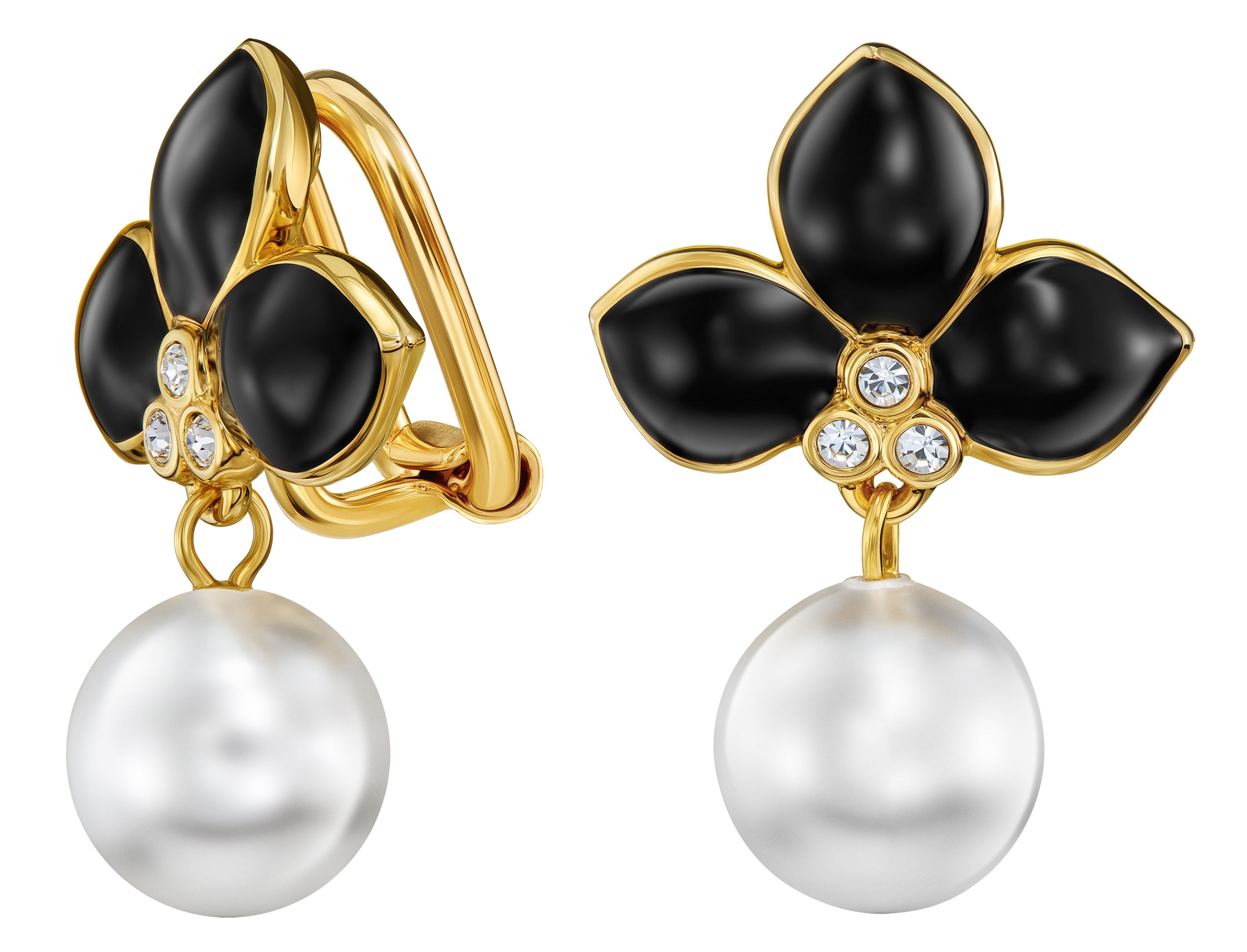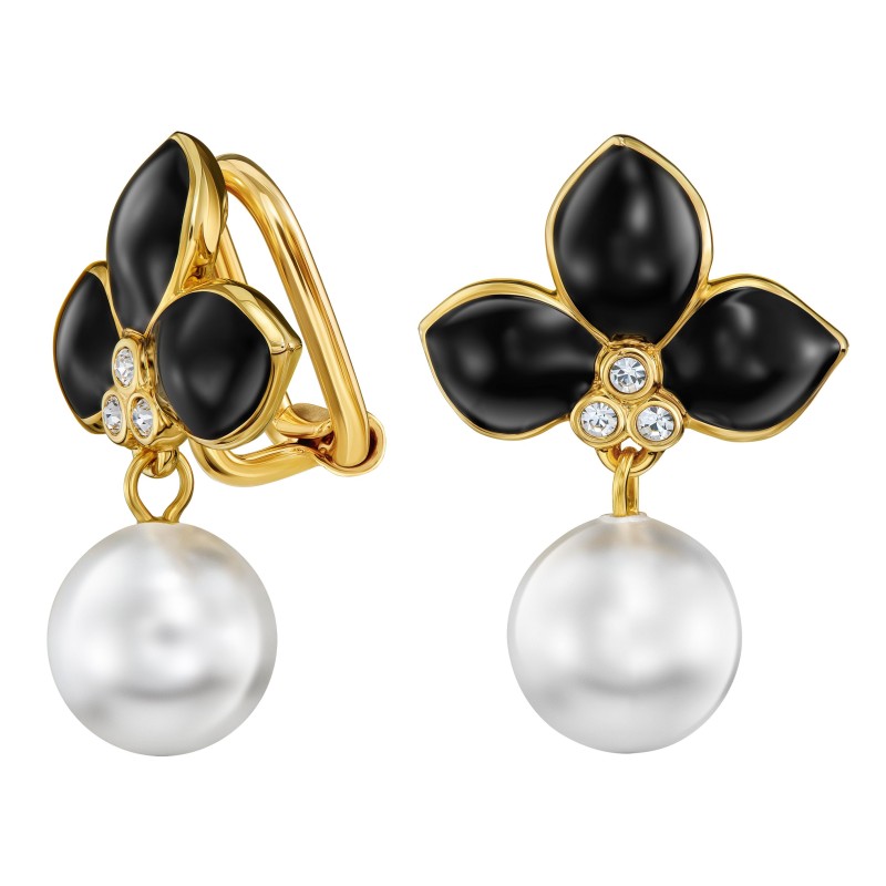 Met deze chique vergulde oorclips van Traveller straal je. De klassieke witte pareloorbel heeft in dit ontwerp bovenaan 3 stralende zwarte emaillen blaadjes met daaronder 3 fonkelende kristallen van Preciosa. De hoogwaardige imitatieparels komen van Mallorca - een eiland dat bekend staat om zijn parels. De geplatineerde oorbellen zijn 26 x 18 millimeter groot en wegen per stuk 4 gram. Dankzij het unieke sluitingssysteem van Traveller zijn deze oorclips zeer comfortabel, licht en veilig om te dragen.