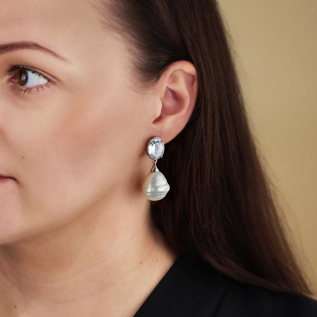 Traveller Clip Oorbellen - Hangers - Zilverkleurig - Barok Parels - 20x17mm - Kristallen - Geplatineerd - 42x17mm
