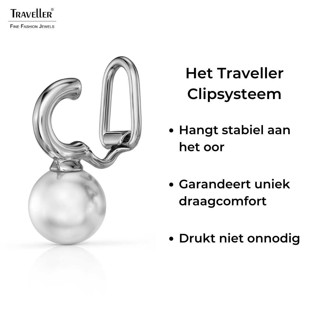 Oorbellen van Traveller met een klassiek en tijdloos ontwerp. Deze oorclips staan bij elke outfit en laten je altijd stralen! Aan de geplatineerde clips hangt een hoogwaardige witte imitatieparel, afkomstig van Mallorca – een eiland dat bekendstaat om zijn parels. De oorbellen zijn in totaal 20 x 10 millimeter groot en wegen per stuk 2,5 gram. Dankzij het unieke sluitingssysteem van Traveller zijn deze oorclips zeer comfortabel, licht en veilig om te dragen.
