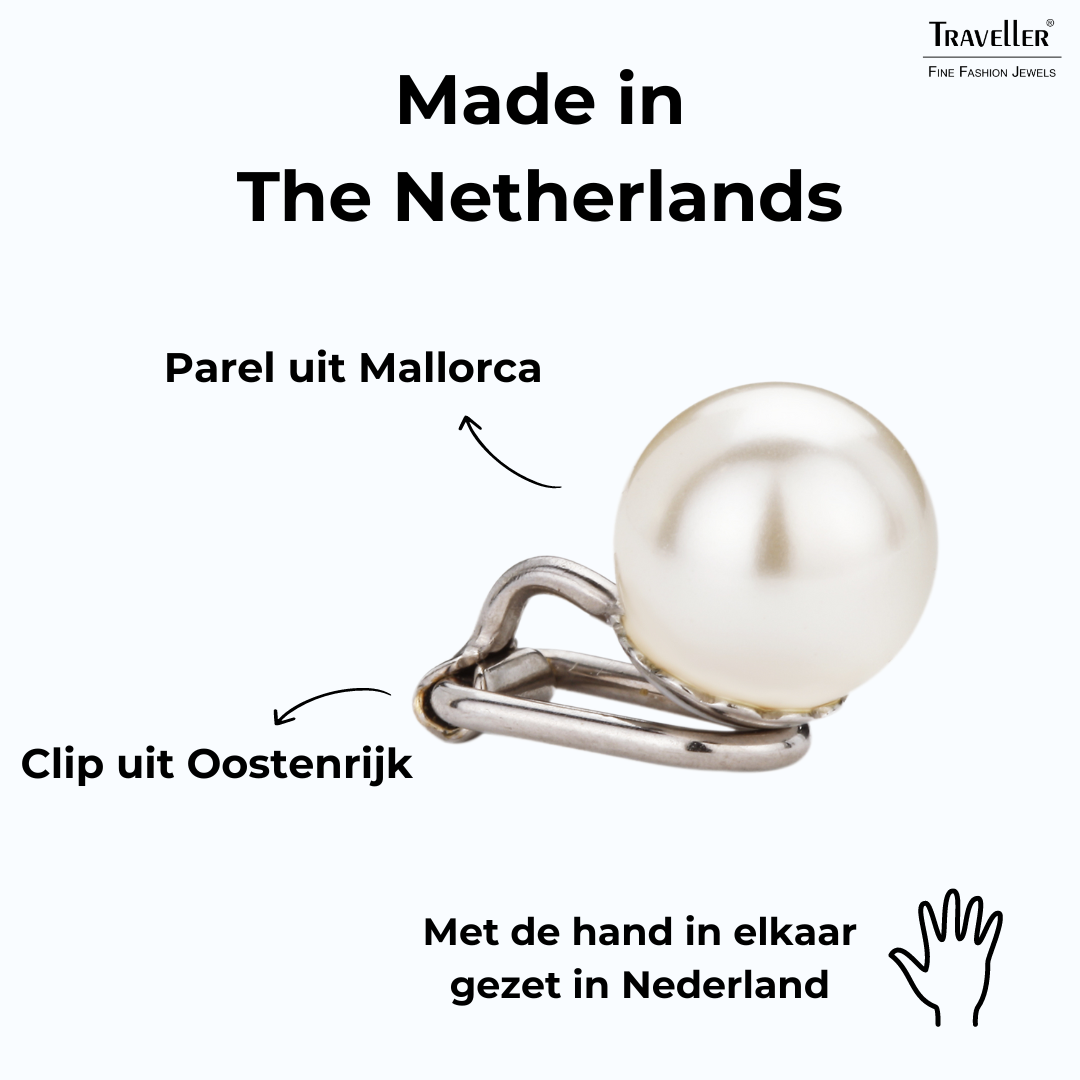 De klassieke pareloorbel straalt elegantie en klasse uit. Deze pareloorclips van Traveller hebben hoogwaardige imitatieparels van Mallorca - een eiland dat bekendstaat om zijn parels. De crèmekleurige parels hebben een diameter van 10 millimeter. De oorbellen zijn voorzien van een beschermingslaagje platinum en wegen per stuk slechts 2 gram. Dankzij het unieke sluitingssysteem van Traveller zijn deze oorclips zeer comfortabel, licht en veilig om te dragen.