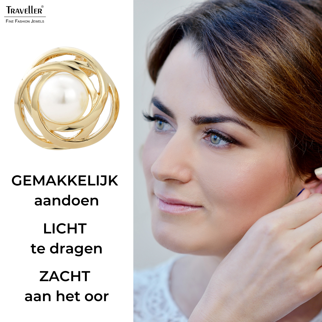 Deze bijzondere oorbellen van Traveller hebben een artistiek ontwerp met als midden een crèmekleurige parel. Deze hoogwaardige imitatieparel, met een diameter van 10 millimeter, is afkomstig uit Mallorca - een eiland dat bekendstaat om zijn parels. De oorbellen hebben in totaal een diameter van 21 millimeter., het goudkleurige gedeelte is verguld met 22 karaat goud. Dankzij het unieke sluitingssysteem van Traveller, zijn deze oorclips zeer comfortabel, licht en veilig om te dragen.