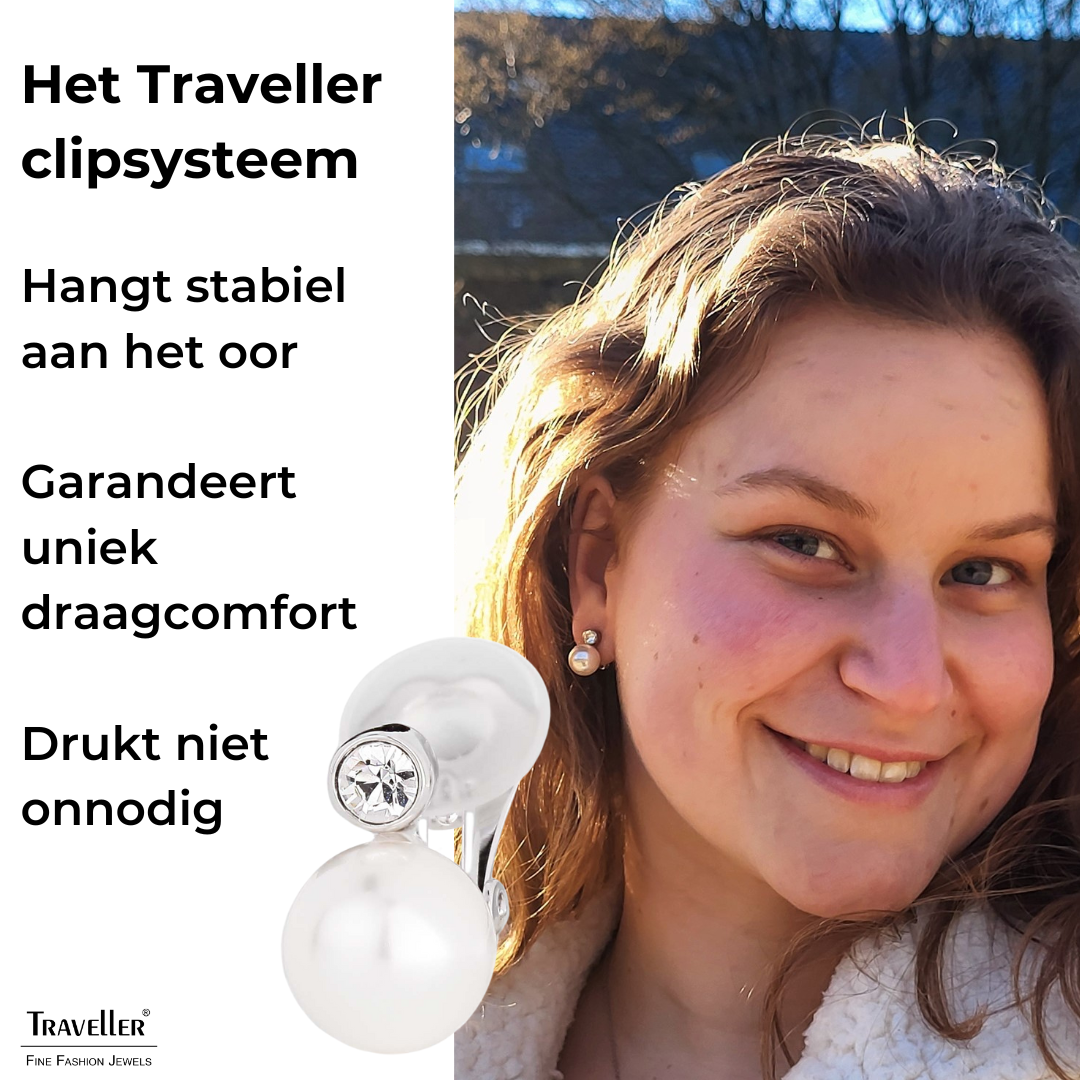 Met deze chique oorclips van Traveller straal je. De klassieke witte pareloorbel heeft in dit ontwerp bovenaan een fonkelend kristal van Preciosa. De hoogwaardige imitatieparels komen van Mallorca - een eiland dat bekend staat om zijn parels. De geplatineerde oorbellen zijn 15 x 10 millimeter groot en wegen per stuk 4 gram. Dankzij het unieke sluitingssysteem van Traveller zijn deze oorclips zeer comfortabel, licht en veilig om te dragen.