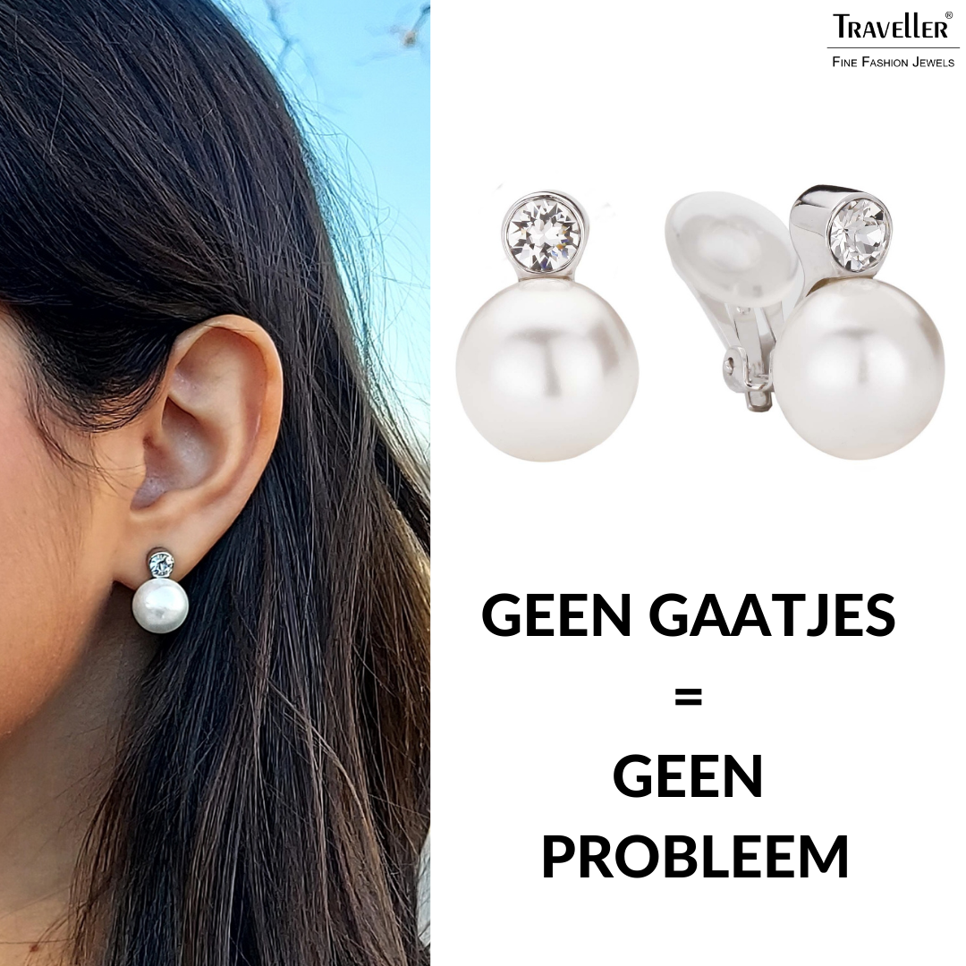 Deze chique oorclips van Traveller laten je stralen. De klassieke crèmekleurige pareloorbellen hebben in dit ontwerp bovenaan een fonkelend kristal van Preciosa. De hoogwaardige imitatieparels komen van Mallorca - een eiland dat bekend staat om zijn parels. De geplatineerde oorbellen zijn 15 x 12 millimeter groot en wegen per stuk 5 gram. Dankzij het unieke sluitingssysteem van Traveller zijn deze oorclips zeer comfortabel, licht en veilig om te dragen.