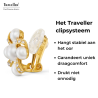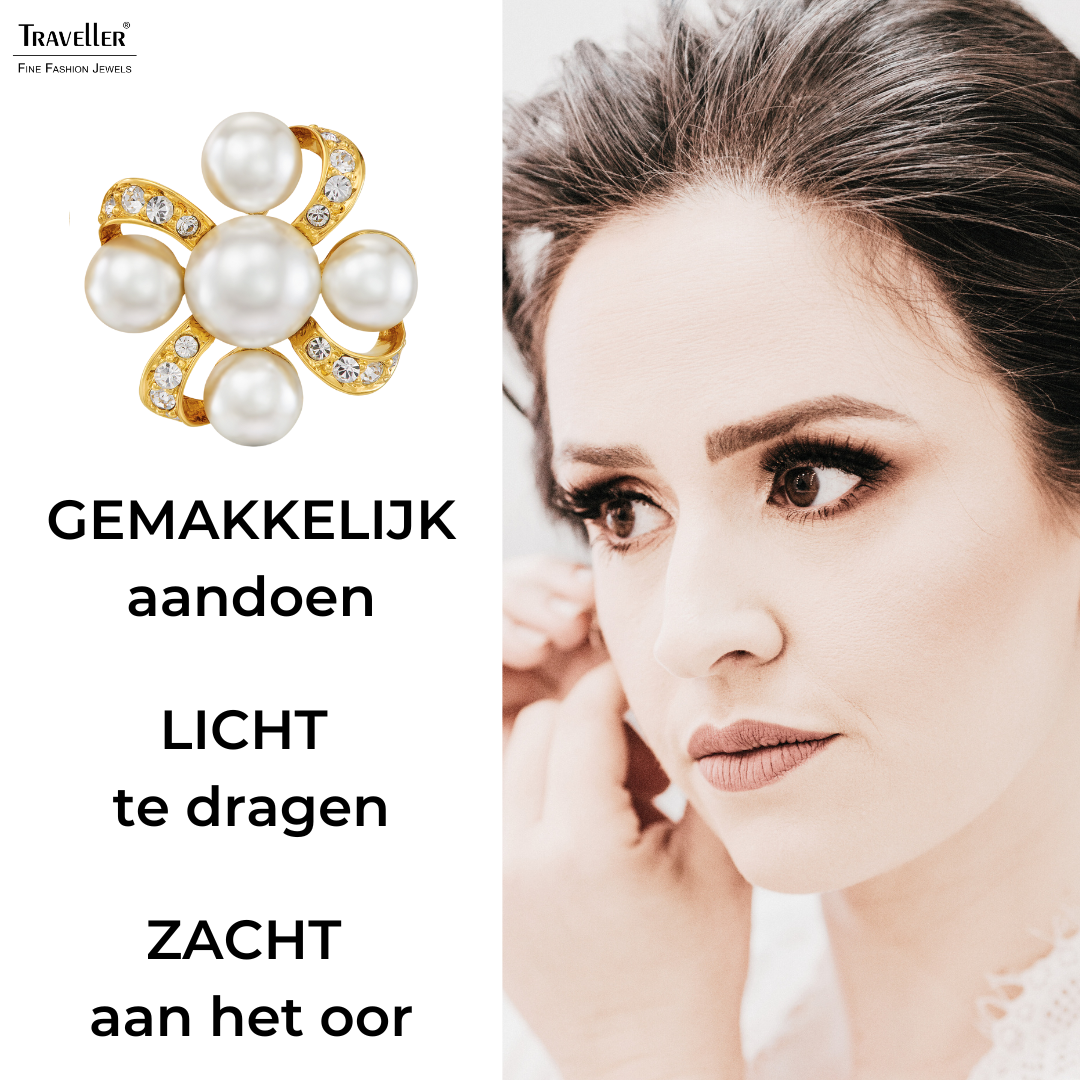 Dit paar elegante kroonvormige clip oorbellen van Traveller heeft een prachtig design met glanzende parels en schitterende kristallen. Een stralende witte parel met een diameter van 8 millimeter vormt het hart van deze goudkleurige "kroon". Om dit hart heen vormen 4 stroken bezaaid met kristallen van Preciosa afgewisseld door 4 glanzende parels deze majestueuze oorclips. De hoogwaardige imitatieparels komen van Mallorca - een eiland dat bekendstaat om zijn parels. De oorclips zijn volledig verguld met 22 karaat goud en wegen per stuk 3,75 gram. Dankzij het unieke sluitingssysteem van Traveller zijn ze zeer licht, comfortabel en veilig om te dragen.