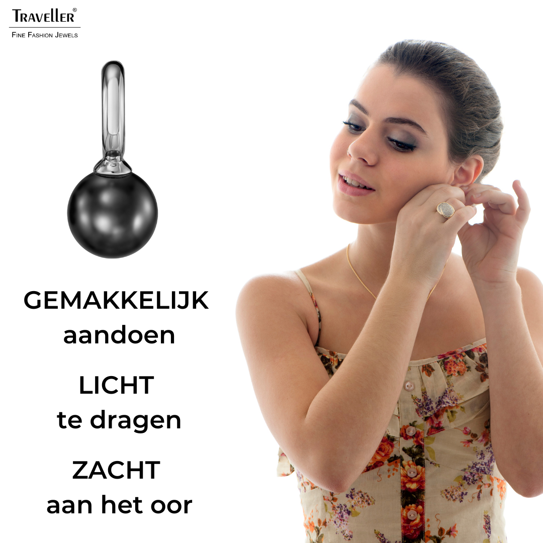 Oorbellen van Traveller met een klassiek en tijdloos ontwerp. Deze oorclips staan bij elke outfit en laten je altijd stralen! Aan de geplatineerde clips hangt een hoogwaardige zwarte imitatieparel, afkomstig van Mallorca – een eiland dat bekendstaat om zijn parels. De oorbellen zijn in totaal 20 x 10 millimeter groot en wegen per stuk 2,5 gram. Dankzij het unieke sluitingssysteem van Traveller zijn deze oorclips zeer comfortabel, licht en veilig om te dragen.