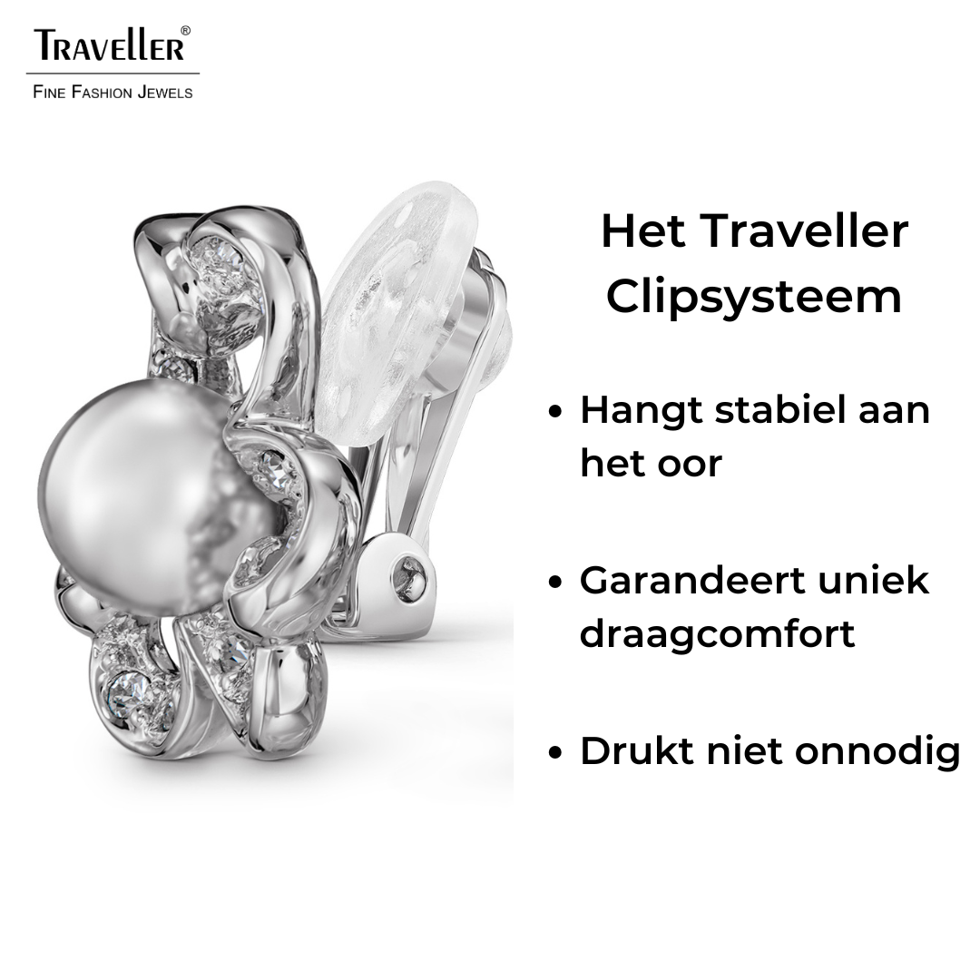 Dit paar stralende oorbellen van Traveller heeft een prachtig design: chique en tevens speels. De witte parel heeft een diameter van 8 millimeter en vormt het hart van een bloemetje. Deze hoogwaardige imitatieparels komen van Mallorca - een eiland dat bekendstaat om zijn parels. De blaadjes van deze geplatineerde oorclips zijn bezaaid met kristallen van Preciosa. Per stuk weken de oorbellen 4 gram en dankzij het unieke sluitingssysteem van Traveller zijn ze zeer licht, comfortabel en veilig om te dragen.