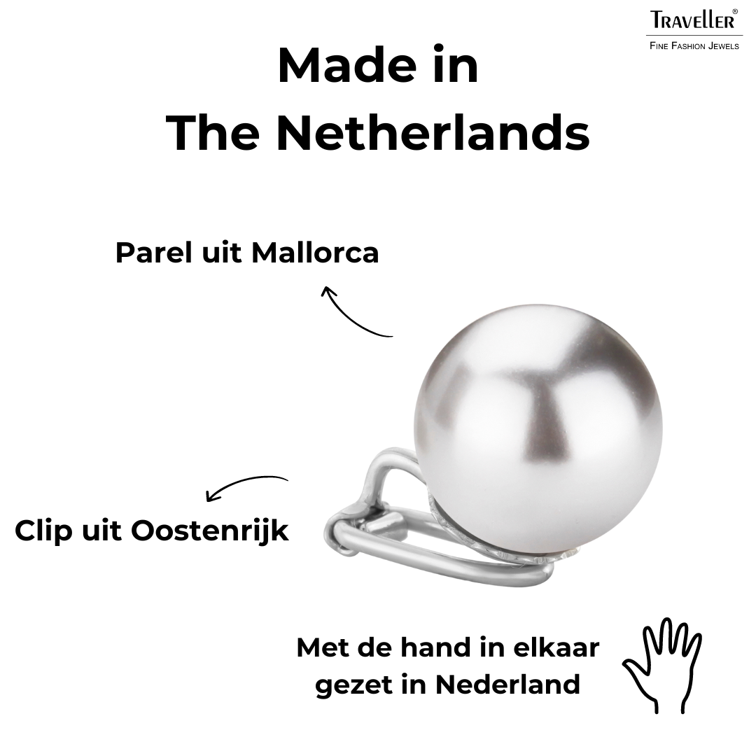 De klassieke pareloorbel in een grote variant van Traveller met grijze parels. Dit paar tijdloze, classy oorbellen bestaat uit een volledig geplatineerde clip met daarop een hoogwaardige imitatieparel, afkomstig uit Mallorca – een eiland dat bekendstaat om zijn parels. De parels hebben een diameter van 14 millimeter. Per stuk wegen de oorbellen zo’n 4 gram.