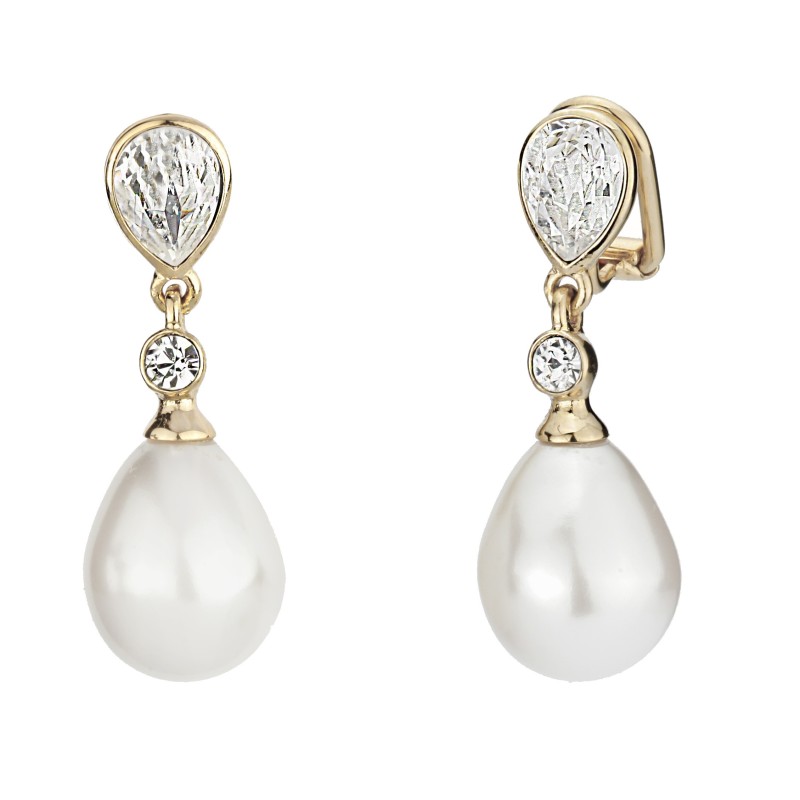 Traveller Oorbellen zonder Gaatjes - Hangers - Parels - 15x12 mm - Wit - Preciosa Kristallen - 22ct Verguld - 32x12 mm