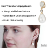 Parels en kristallen maken deze oorclips van Traveller een paar schitterende accessoires. De met 22 karaat goud vergulde oorbellen bestaan uit kristallen van Preciosa en een druppelvormige hoogwaardige imitatieparel uit Mallorca - een eiland dat bekendstaat om zijn parels. De witte parel is 15 x 12 millimeter groot, de oorbellen zijn in totaal 32 x 12 millimeter groot. Dankzij het unieke sluitingssysteem van Traveller zijn deze oorclips zeer comfortabel, licht en veilig om te dragen.