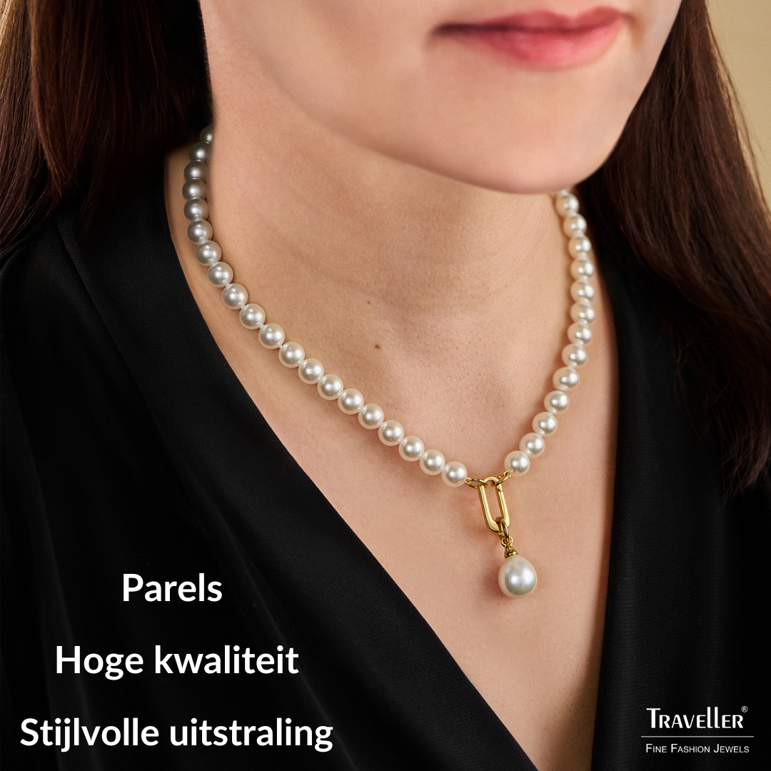 De klassieke parelketting staat voor klasse en elegantie en heeft zijn comeback gemaakt. Deze parelketting van Traveller heeft hoogwaardige imitatieparels van Mallorca - een eiland dat bekendstaat om zijn parels. De parels in deze met 22 karaat goud vergulde ketting hebben een diameter van 8 millimeter. Aan de ketting van 45 centimeter lang hangt een schitterende witte ovale parel van 14 x 12 millimeter. Een keer geen zin in de hanger? De ketting is ook prima te dragen zonder.
