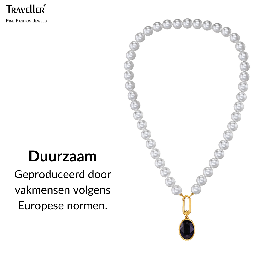 De klassieke parelketting staat voor klasse en elegantie en heeft zijn comeback gemaakt. Deze parelketting van Traveller heeft hoogwaardige imitatieparels van Mallorca - een eiland dat bekendstaat om zijn parels. De parels in deze met 22 karaat goud vergulde ketting hebben een diameter van 10 millimeter. Aan de ketting van 45 centimeter lang hangt een schitterend donker blauw ovalen kristal van Preciosa Crystals. Een keertje geen zin in de hanger? De ketting is ook prima te dragen zonder. De ketting is verpakt in een geschenkverpakking van milieugecertificeerd materiaal.