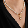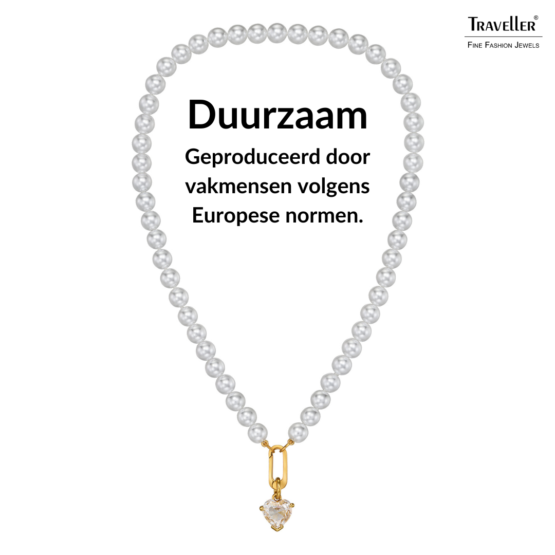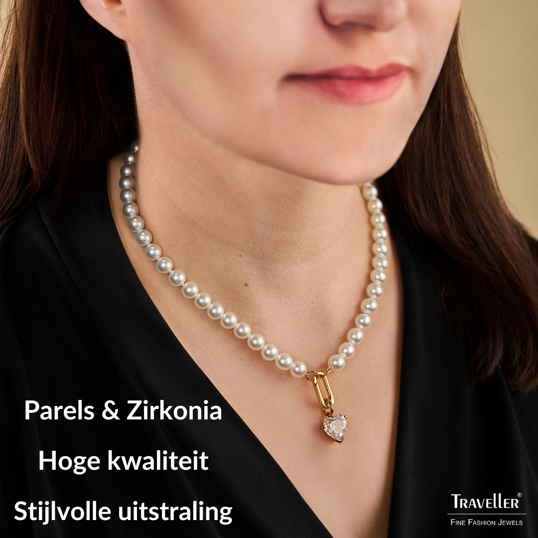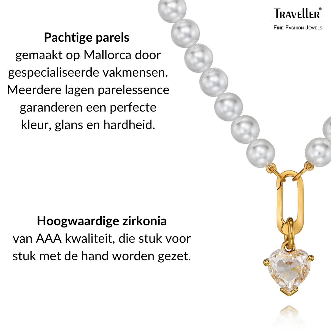 De klassieke parelketting staat voor klasse en elegantie en heeft zijn comeback gemaakt. Deze parelketting van Traveller heeft hoogwaardige imitatieparels van Mallorca - een eiland dat bekendstaat om zijn parels. De parels in deze met 22 karaat goud vergulde ketting hebben een diameter van 8 millimeter. Aan de ketting van 45 centimeter lang hangt een schitterend zirconia hart van Preciosa Crystals. Een keertje geen zin in de hanger? De ketting is ook prima te dragen zonder.