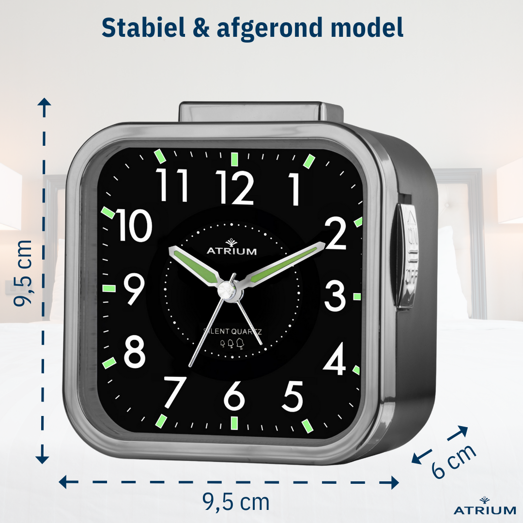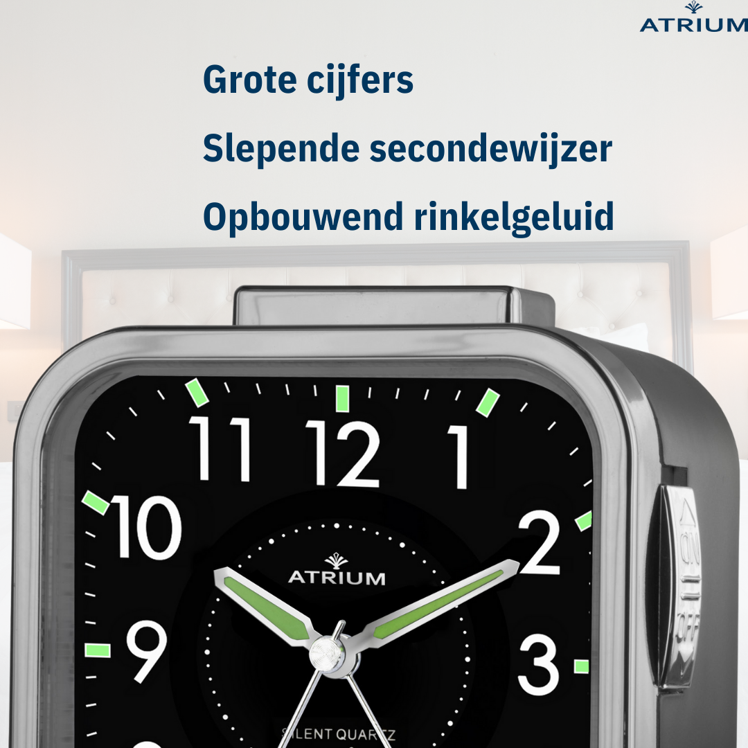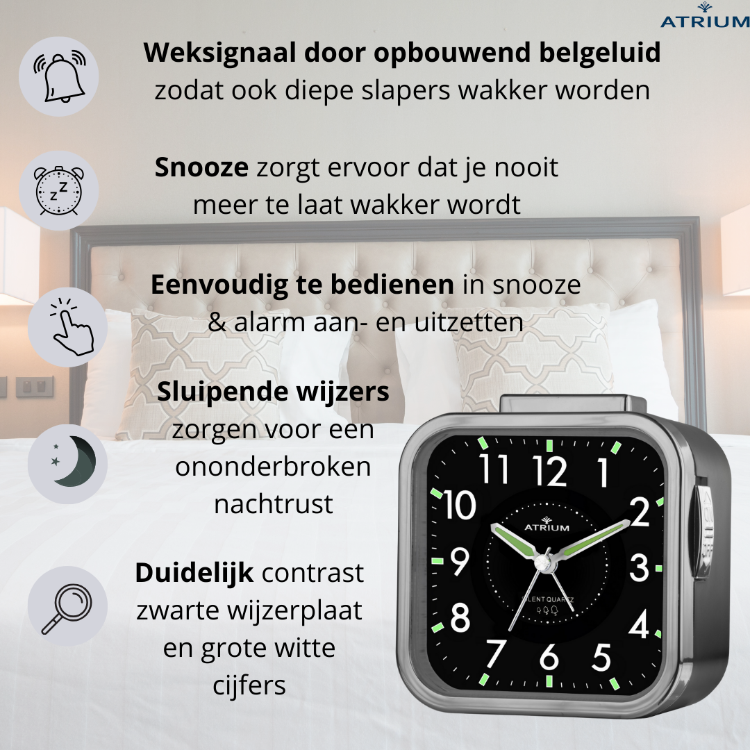 De klassieke wekker van ATRIUM wekt je met een stijgend weksignaal. Dit betekent dat het belletje eerst klinkt met een langzame interval en dan steeds sneller en dus intensiever wordt. Het zachte lichtje en de "glow-in-the-dark" wijzers zorgen ervoor dat de kloktijd ook in het donker leesbaar is. Het lichtje gaat aan als op de knop gedrukt wordt. De instelknoppen zijn goed tastbaar wat er, net als de grote cijfers voor zorgt, dat de bediening van de wekker gemakkelijk is. De sluimerfunctie kan ingesteld worden tot 6x herhaling in 5 minuten. Verder zorgt het geruisarme Quartz uurwerk voor een ongestoorde slaap.