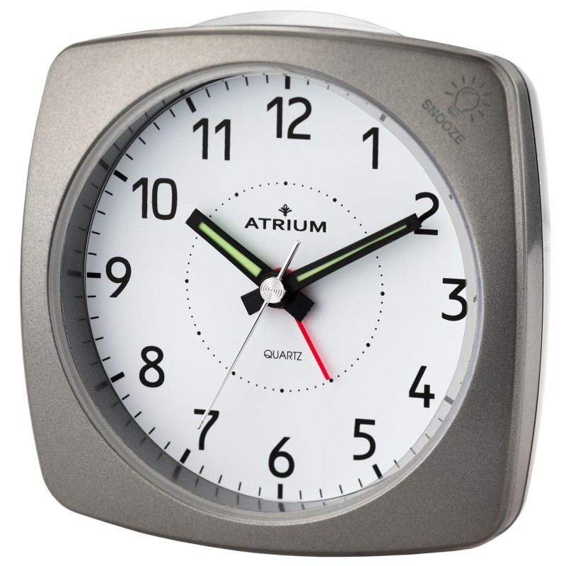 De elegante en klassieke wekker van ATRIUM in metallic antraciet heeft bovenop een knop om het alarm uit te schakelen, een sluimerfunctie en verlichting die knippert als het alarm afgaat. De sluimerfunctie en het licht worden geactiveerd door te drukken op de rand van de behuizing. Het geruisarme quartz uurwerk met een slepende secondewijzer zorgt voor een ongestoorde nachtrust. Grijpvaste instelknoppen op de achterkant vergemakkelijken de bediening.
