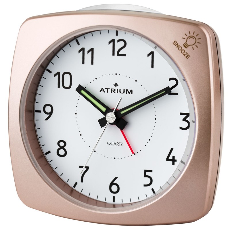 De elegante en klassieke wekker van ATRIUM in brons metallic heeft bovenop een knop om het alarm uit te schakelen, een sluimerfunctie en verlichting die knippert als het alarm afgaat. De sluimerfunctie en het licht worden geactiveerd door te drukken op de rand van de behuizing. Het geruisarme quartz uurwerk met een slepende secondewijzer zorgt voor een ongestoorde nachtrust. Grijpvaste instelknoppen op de achterkant vergemakkelijken de bediening.
