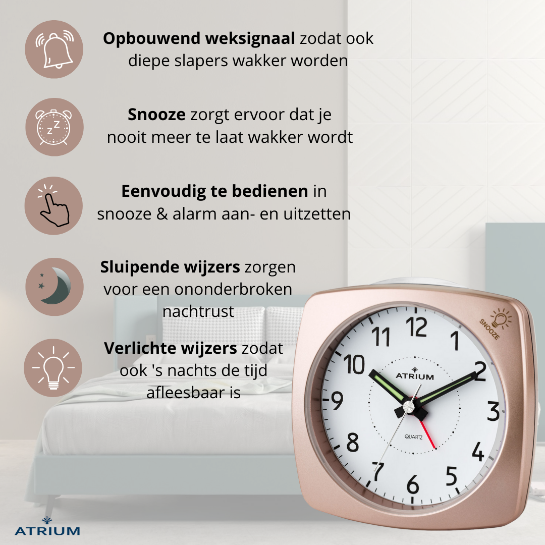ATRIUM Wekker - Analoog - Brons - Zonder Tikgeluid - Opbouwende Pieptoon - Alarm - Snooze