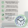 De wijzerplaat verlichting wordt door de drukknop geactiveerd en gaat na enkele seconden automatisch uit. Het oplopende 4-stappen geluidsniveau betekend zorgt dat het weksignaal oploopt in interval en volume. De snooze functie maakt een signaalherhaling tot 9 keer 5 minuten mogelijk. Het geruisarme Quartz uurwerk zorgt bovendien voor een ongestoorde slaap.