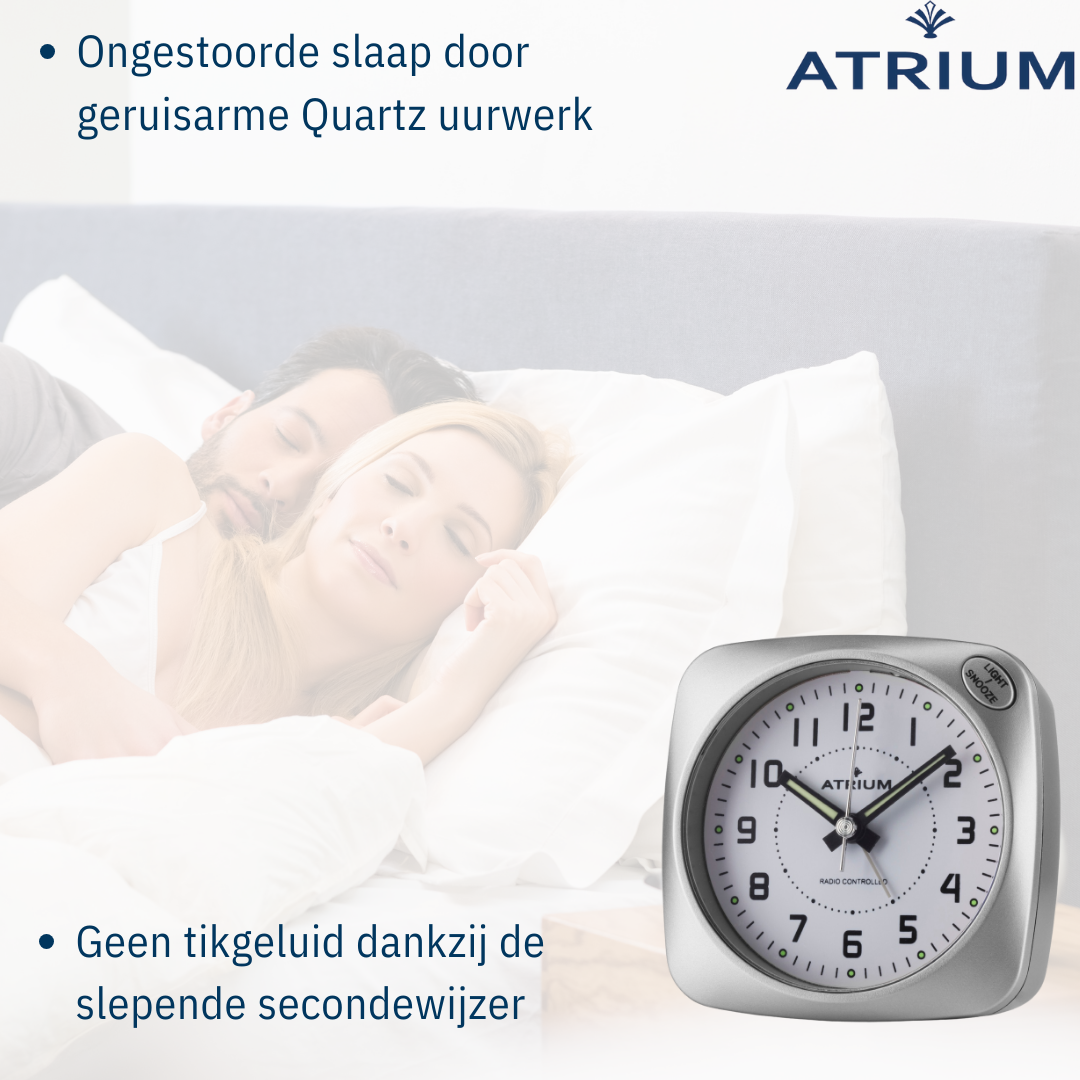 De klassieke analoge radiogestuurde wekker A610-19 van ATRIUM heeft een aangename, afgeronde vorm en is stabiel en makkelijk hanteerbaar door haar afmeting van 8 x 8 centimeter. Het lichtje dat door een drukknop aangaat en de zachte "glow-in-the-dark"-wijzers zorgen ervoor dat ook in het donker de tijd afleesbaar is. De eenvoudig te bedienen instelknoppen op de achterkant en het aparte schuifje om het alarm te activeren zorgen ervoor dat de wekker gemakkelijk is in gebruik, ook voor senioren. Daarnaast zorgt het contrastrijke cijferblad voor een duidelijk af te lezen tijd. Het geruisarme quartz uurwerk zorgt voor een goede, ongestoorde nachtrust.