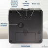 De radiogestuurde wekker van ATRIUM kenmerkt zich met zijn klassieke, tijdloze design. Hij ontvangt het signaal via de Duitse signaalzender DCF77. De instelling van de tijd en de omschakeling naar zomer- en wintertijd gaan automatisch. De mat zwarte vierkante vorm met zilverkleurige bedieningselementen en het eenvoudig ontworpen cijferblad zorgen ervoor dat de wekker een decente en chique uitstraling heeft. Als het alarm is ingeschakeld, wordt het rechthoekje bovenin rood. De grote zwarte getallen vergemakkelijken het aflezen van de kloktijd. Het piepende weksignaal is duidelijk hoorbaar en heeft een opbouwend geluidsniveau. De wekker beschikt ook over een sluimerfunctie. Met de knop bovenop wordt het cijferblad verlicht, na 5 seconden gaat het licht weer automatisch uit. Een moderne decoratie in iedere slaap- of werkkamer.